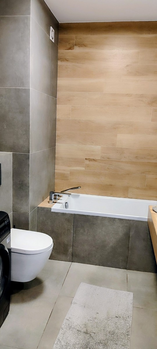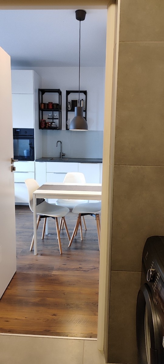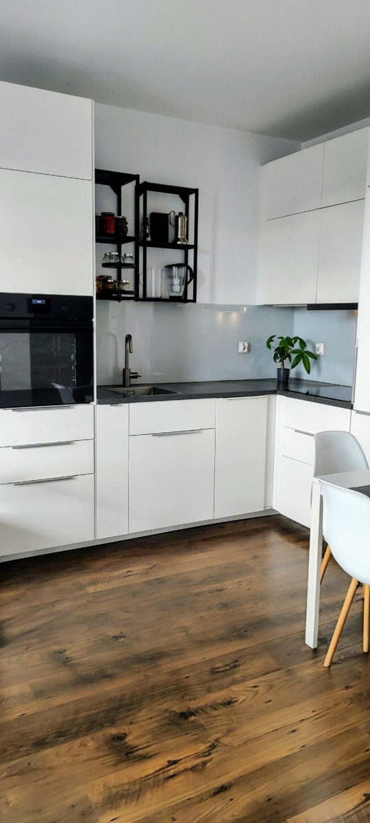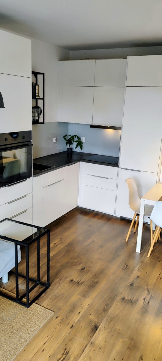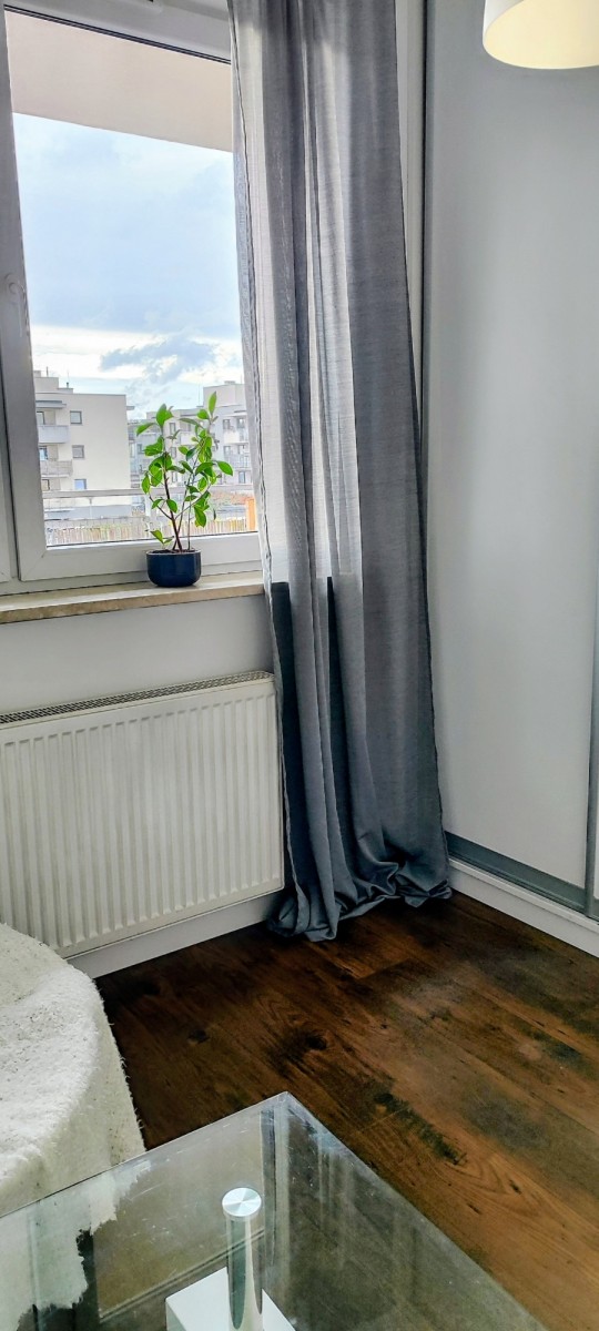Kuchnia otwarta na większy pokój z zabudową mebli i sprzętami AGD (płyta, piekarnik, lodówka, okap, zmywarka). Łazienka z wanną, urządzona w naturalnych barwach. Szafa wnękowa w przedpokoju i w mniejszym pokoju. Na podłodze panele o podwyższonym stopniu ścierania. Mieszkanie ciche, idealne dla osób lubiących ciszę, spokój i bliskość komunikacji przy jednoczesnym braku konieczności słuchania jej odgłosów.