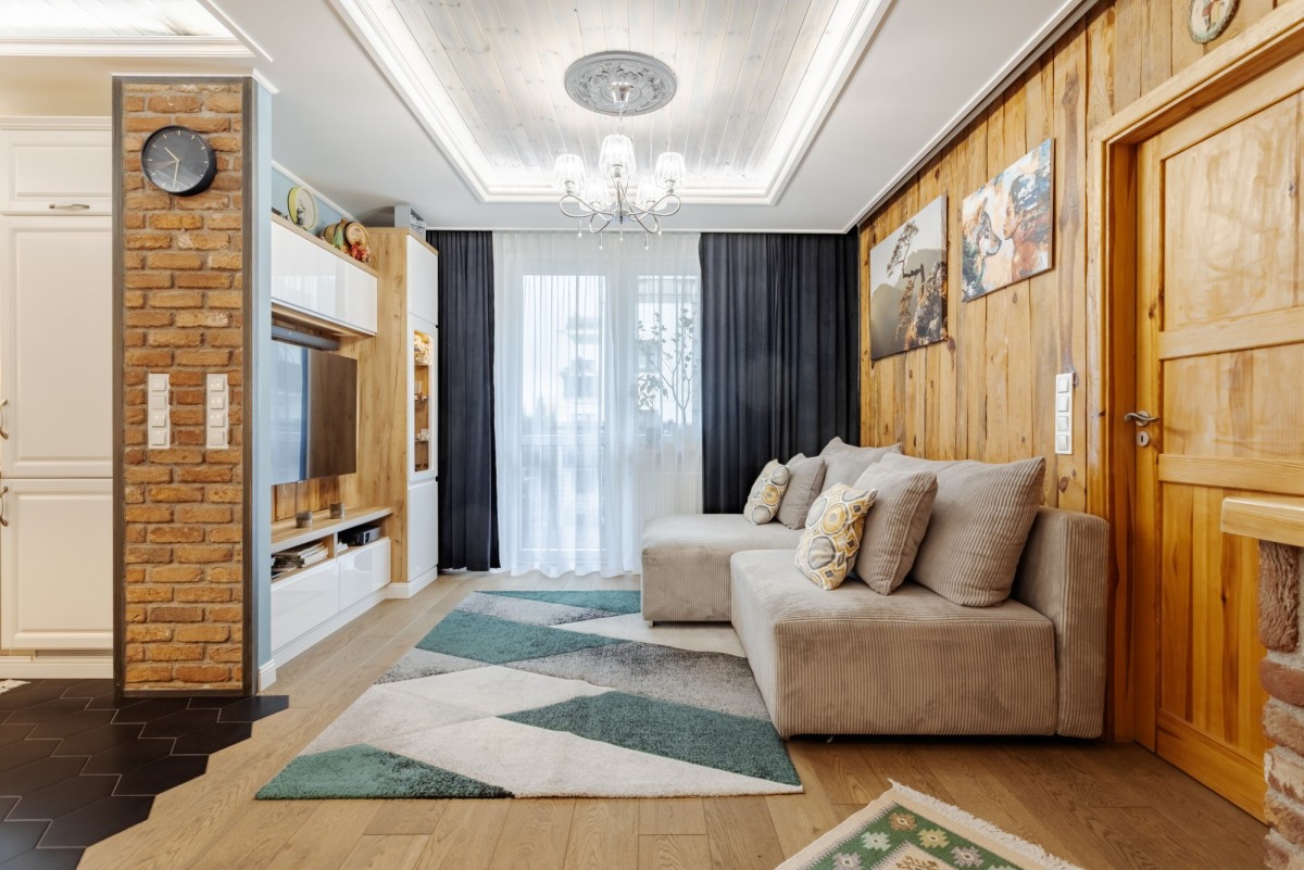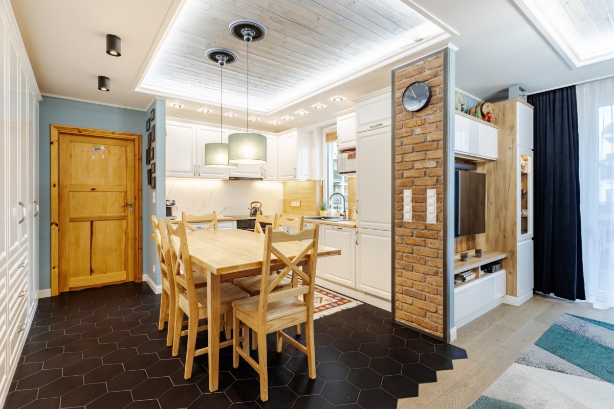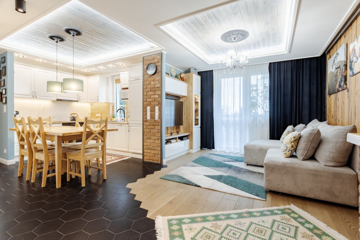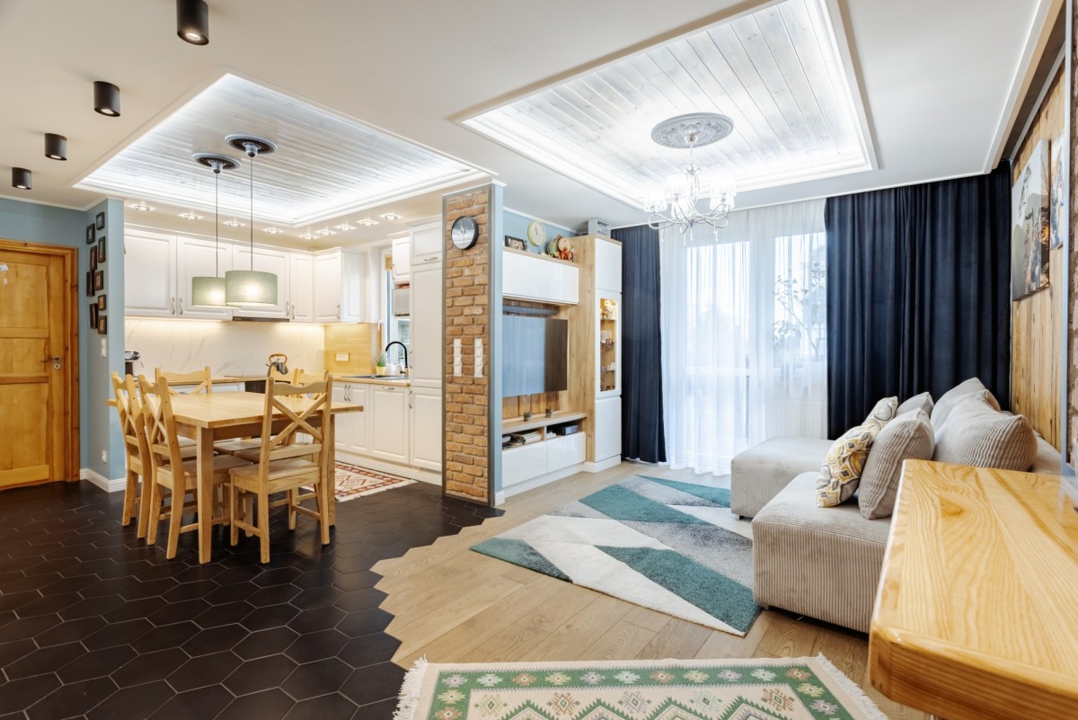 Salon z aneksem kuchennym - przestronny i jasny, z wygodną przestrzenią do wypoczynku i wyjściem na balkon. Aneks wyposażony w nowoczesne sprzęty AGD: piekarnik, płytę indukcyjną, lodówko-zamrażarkę, zmywarkę oraz praktyczną przesuwną wyspę, która świetnie sprawdza się zarówno jako dodatkowy blat, jak i miejsce do wspólnych posiłków.