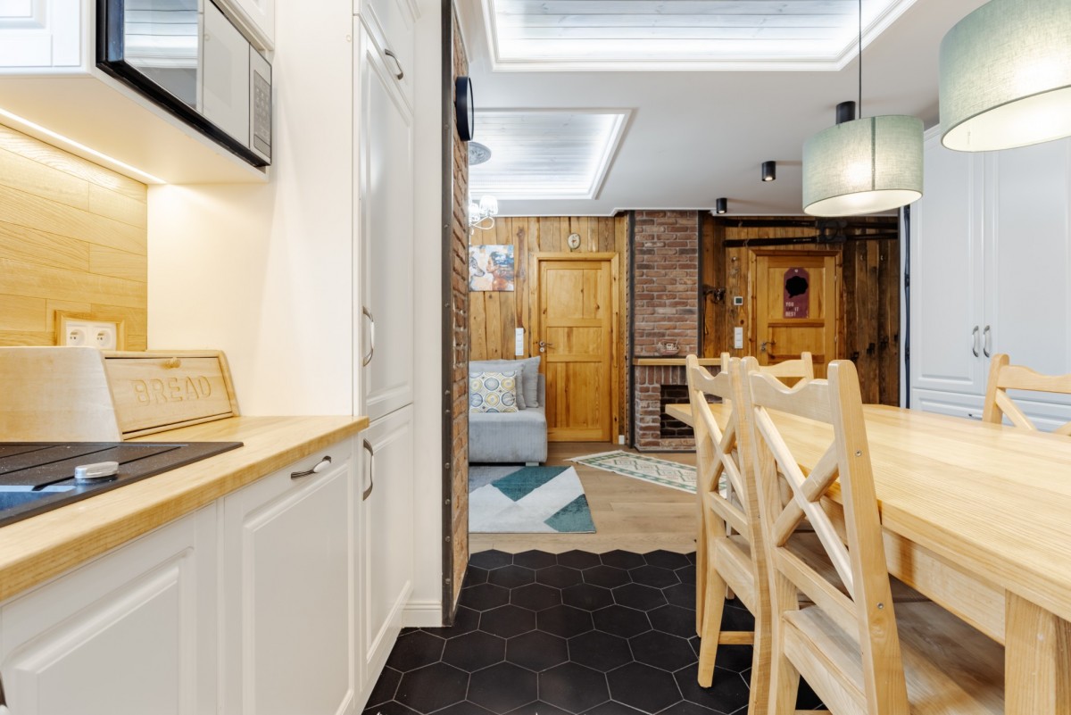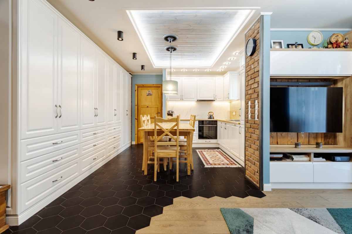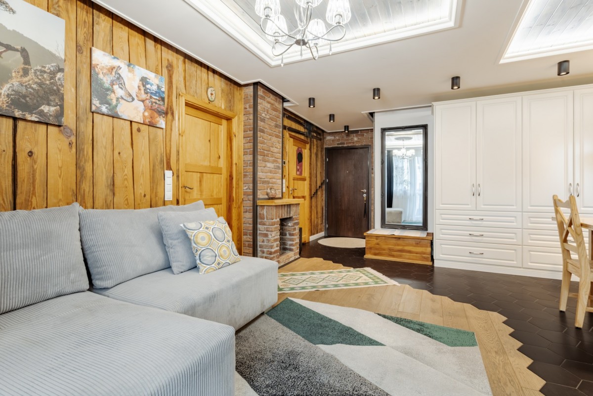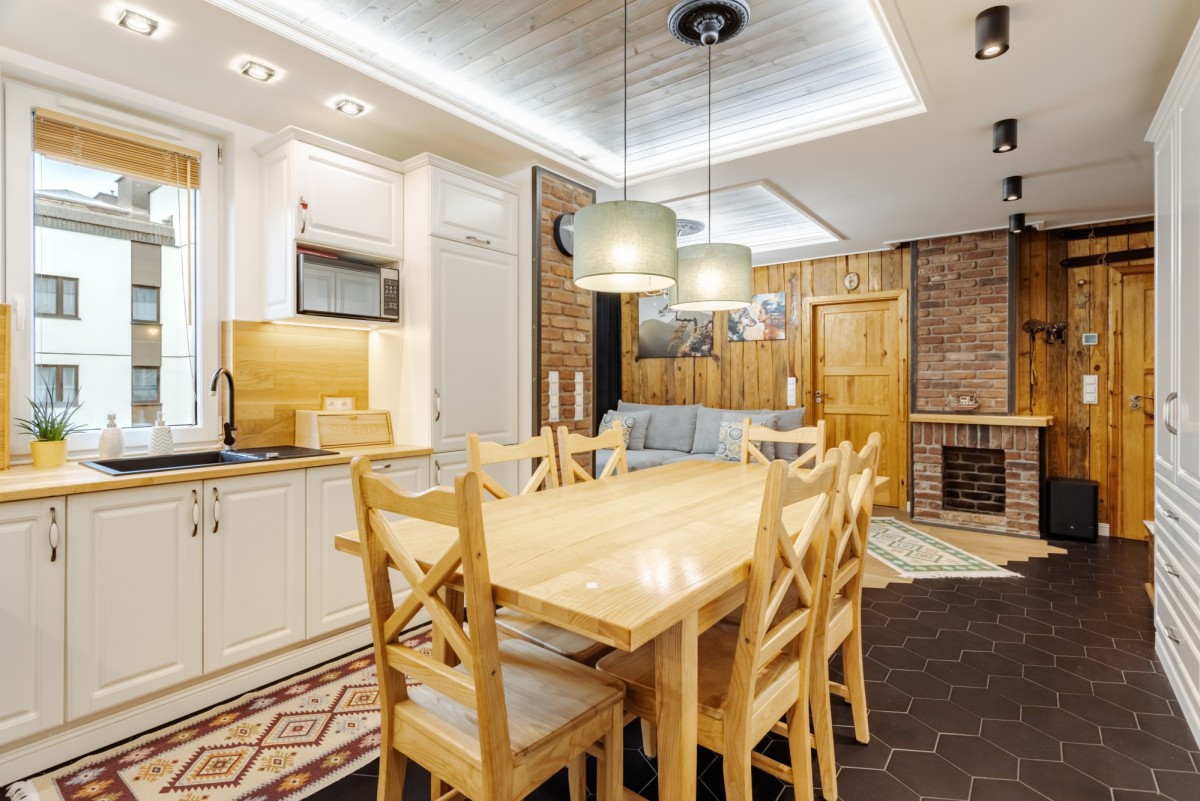 Salon z aneksem kuchennym - przestronny i jasny, z wygodną przestrzenią do wypoczynku i wyjściem na balkon. Aneks wyposażony w nowoczesne sprzęty AGD: piekarnik, płytę indukcyjną, lodówko-zamrażarkę, zmywarkę oraz praktyczną przesuwną wyspę, która świetnie sprawdza się zarówno jako dodatkowy blat, jak i miejsce do wspólnych posiłków.