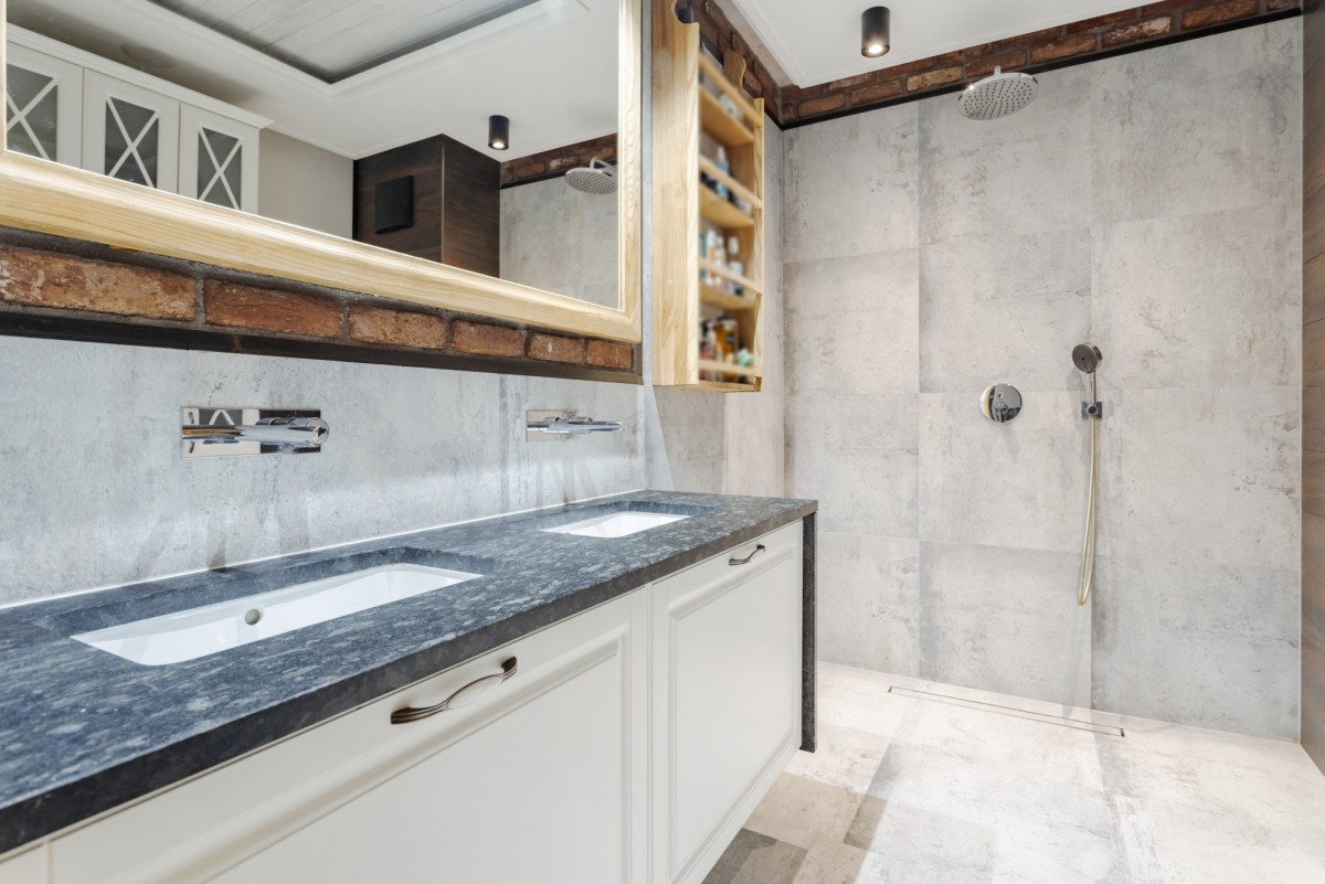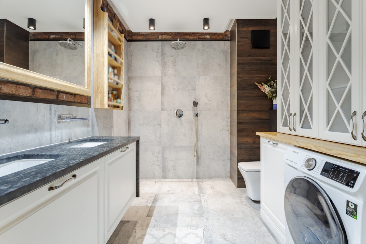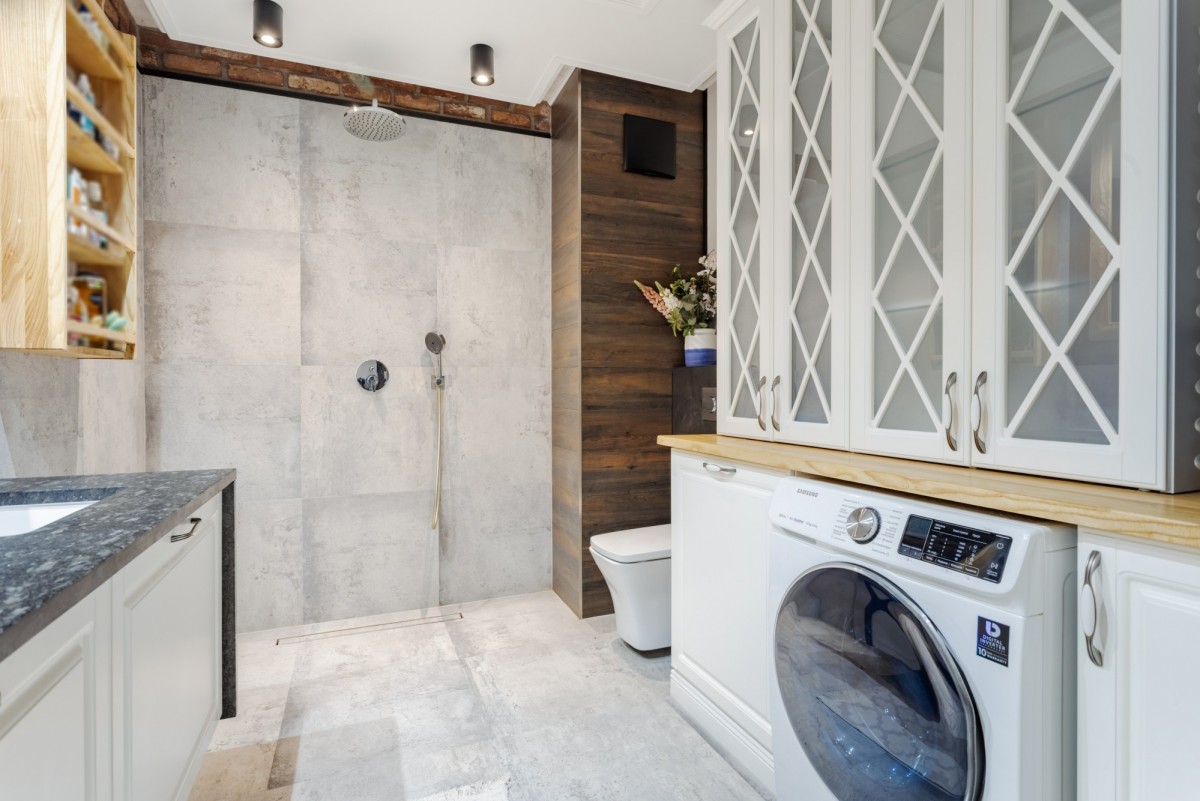 Łazienka - nowoczesna, wyposażona w wannę z nowym szklanym parawanem, pralkę, umywalkę i WC.
