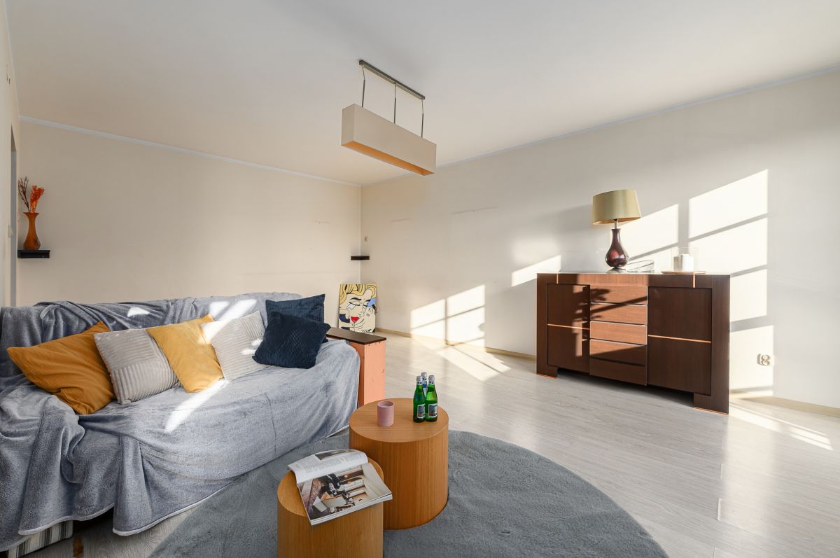 Mieszkanie składa się z przestronnego salonu z wyjściem na balkon oraz lekko odsuniętą w pełni wyposażoną kuchnią. W dalszej części mieszkania sypialnia oraz pokój dziecięcy/ gabinet. Dodatkowo do dyspozycji mamy dużą łazienkę wyposażoną w wannę, WC oraz oddzielna toaleta. Przedpokój z pojemnymi szafami do przechowywania rzeczy.
