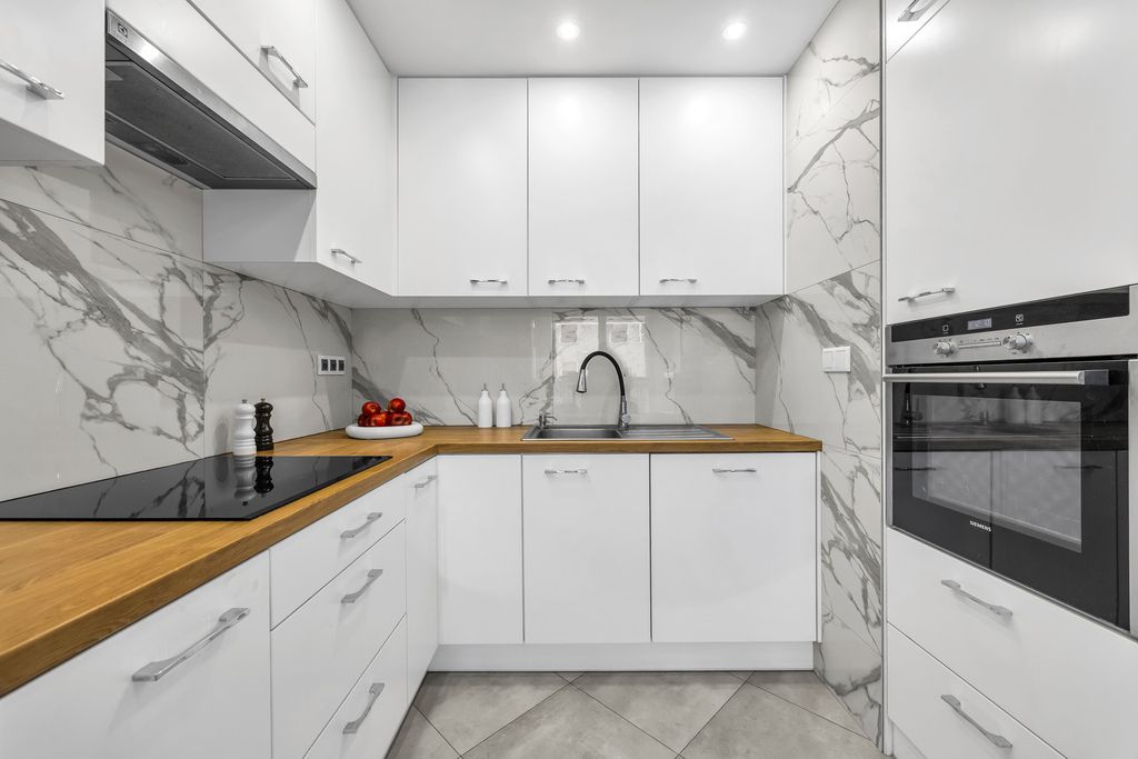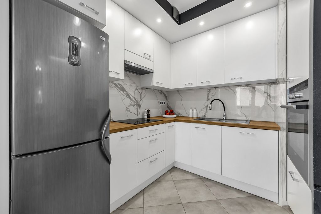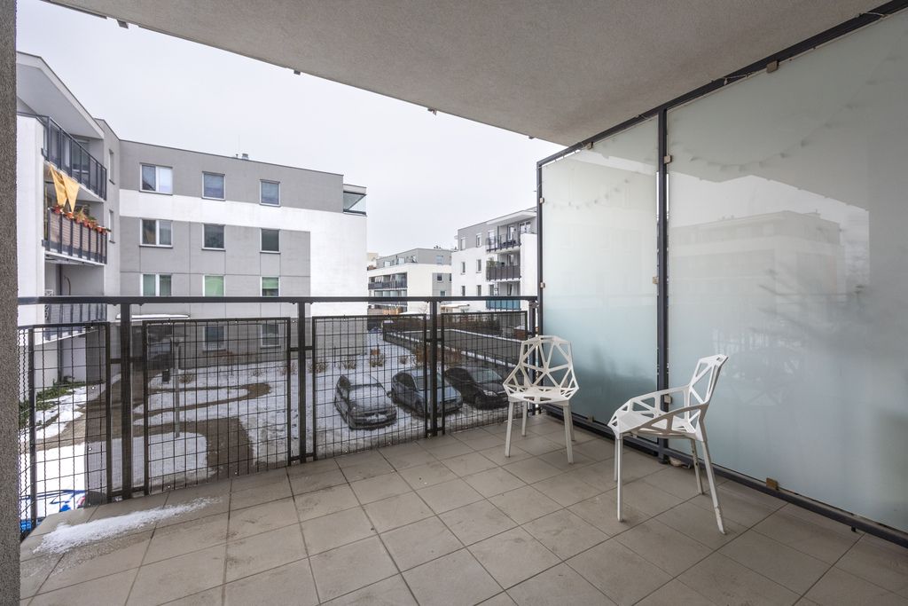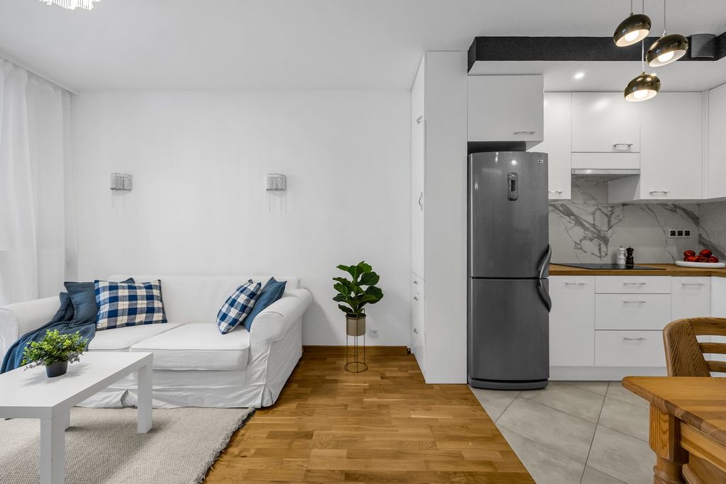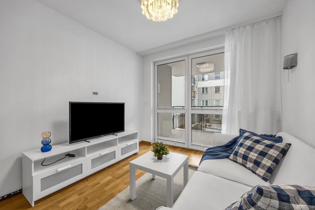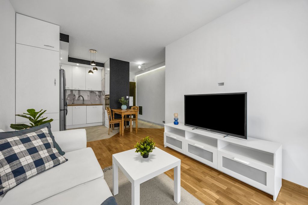 The floors are finished with Barlinek wooden boards and tiles, while both the kitchen and bathroom are fully fitted and ready for immediate use. This is not an apartment that needs just a few finishing touches—you can bring your suitcase and start living right away.