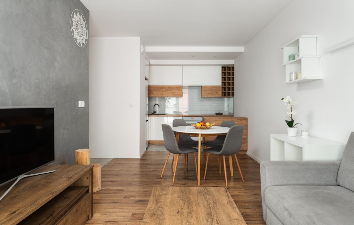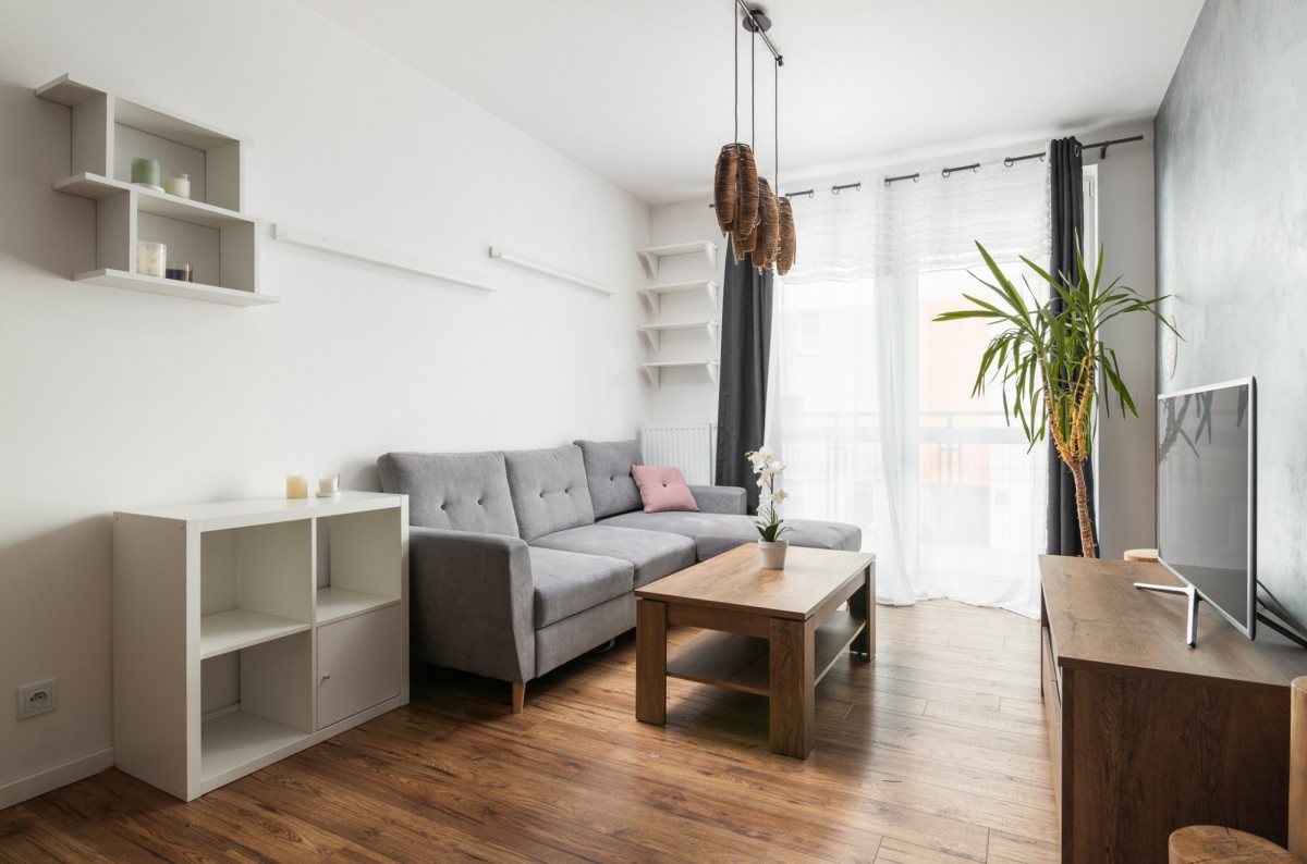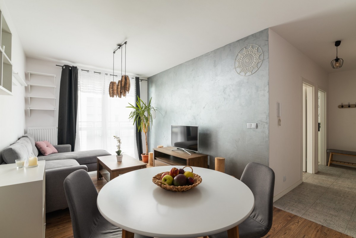 • salon z aneksem kuchennym oraz wyjściem na duży balkon o powierzchni 9m2