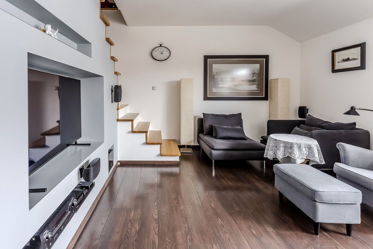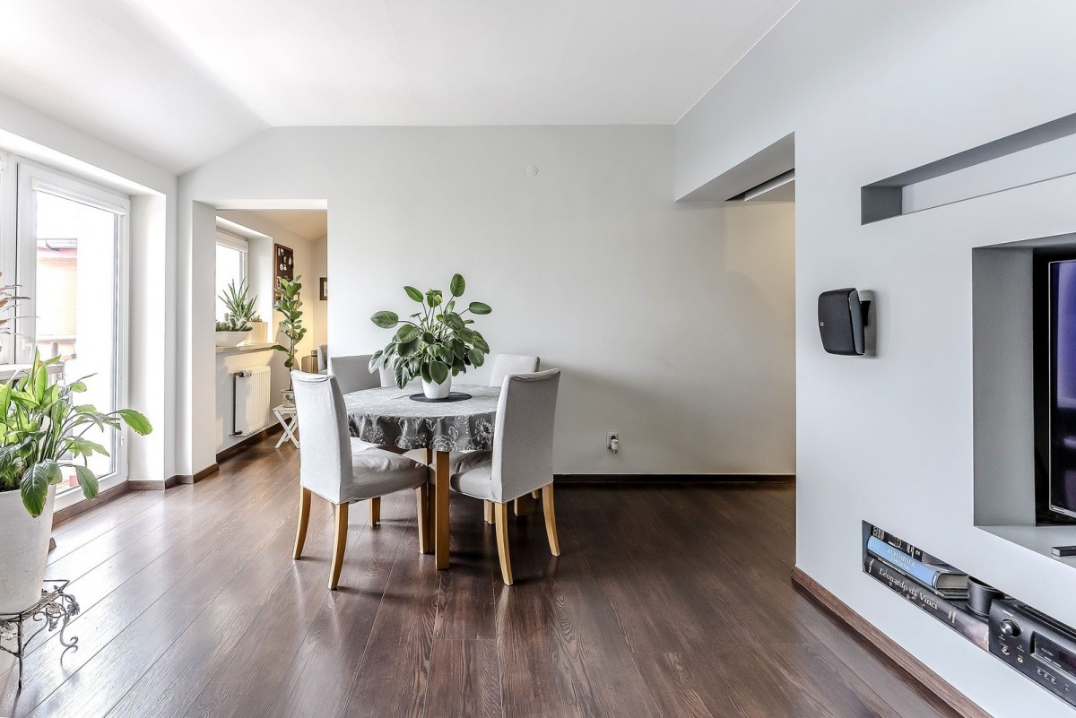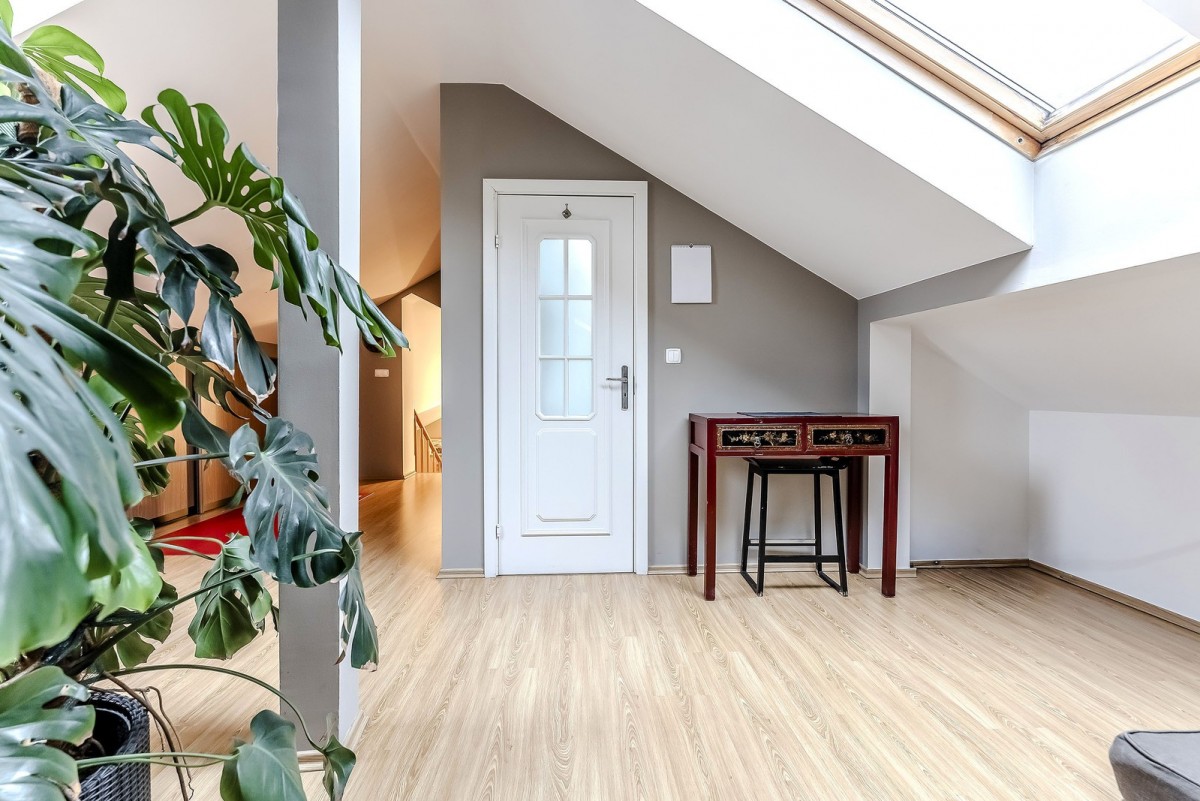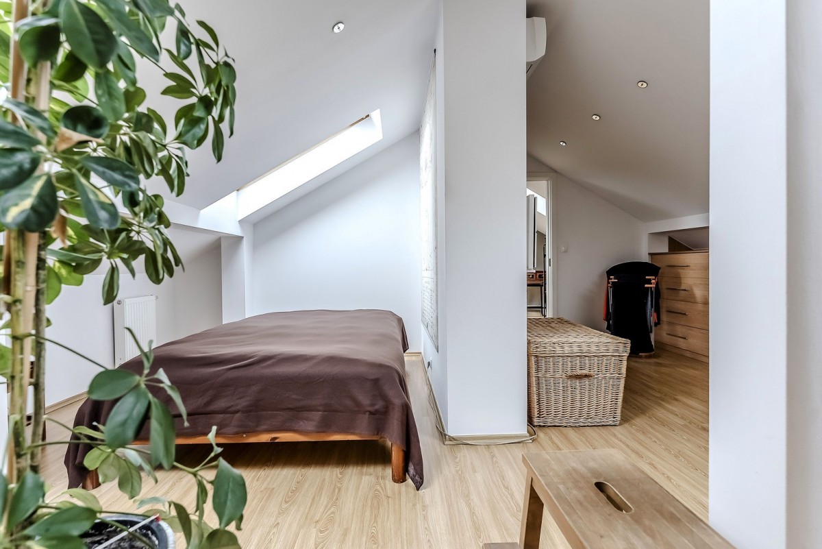 Mieszkanie znajduje się na ostatnim piętrze kameralnego, 3-piętrowego budynku z cegły. Funkcjonalny układ naturalnie dzieli przestrzeń na strefę dzienną i prywatną.