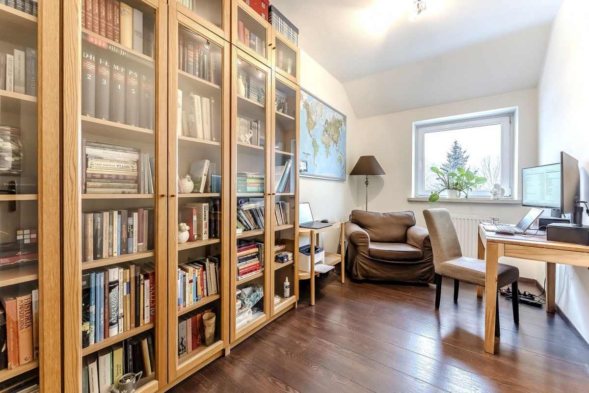 Klimatyczna sypialnia główna oraz dodatkowy pokój (np. biblioteka).