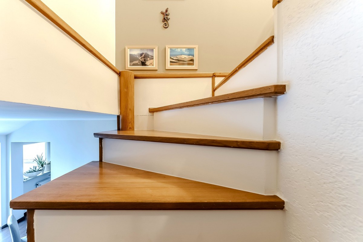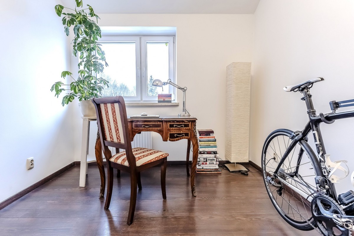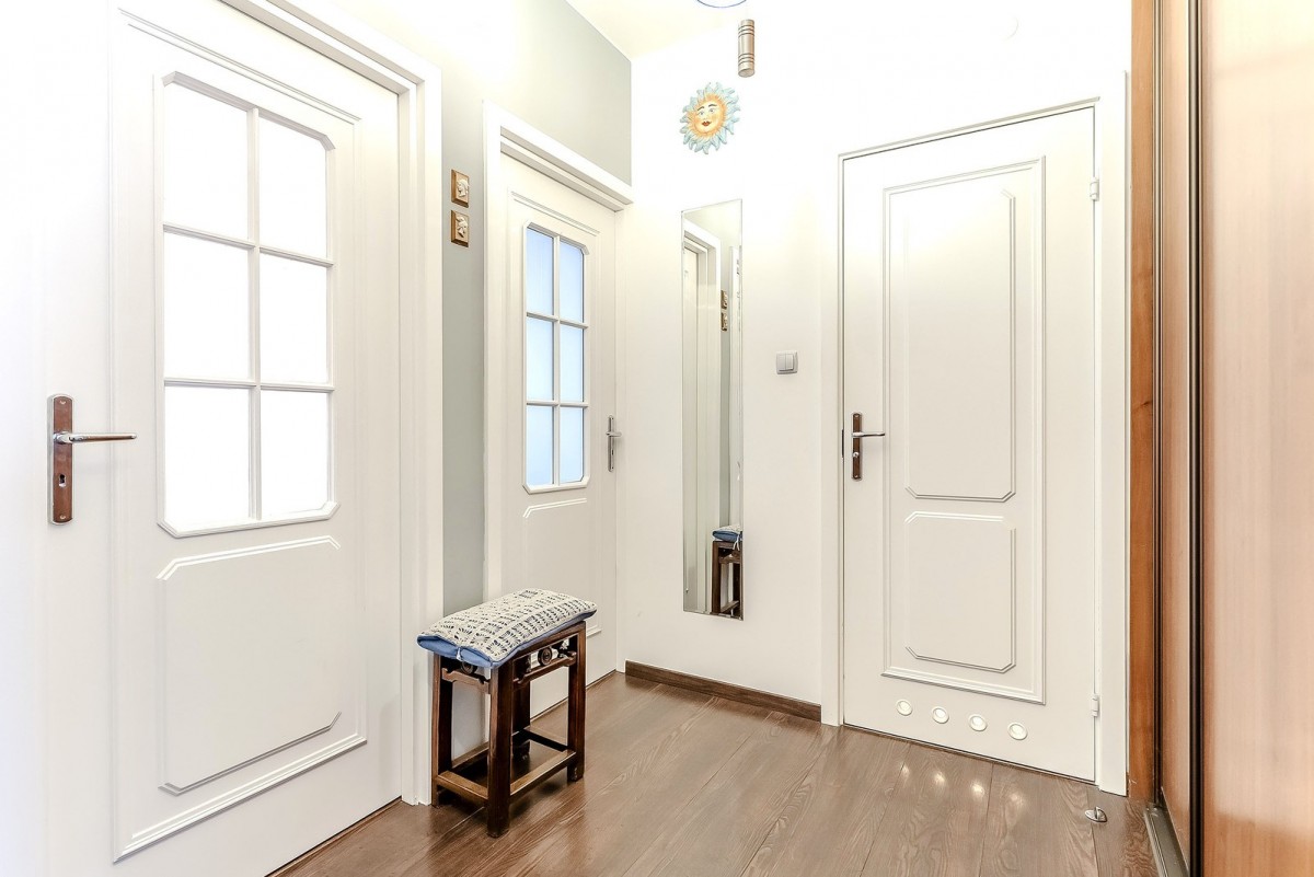 Wnętrza zostały wykończone z dbałością o trwałość i estetykę. Na uwagę zasługują solidne schody dębowe oraz drewniane podłogi, które dodają przytulności. Mieszkanie jest dwustronne (południowy wschód i północny zachód), co gwarantuje naturalne światło przez cały dzień. Nieruchomość jest gotowa do wprowadzenia, a na życzenie kupującego wyposażenie może pozostać w cenie.