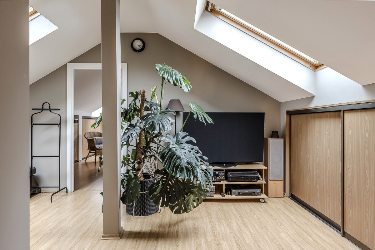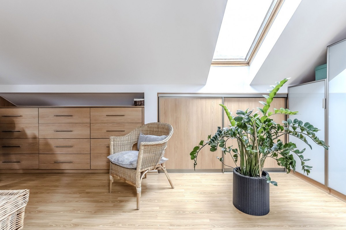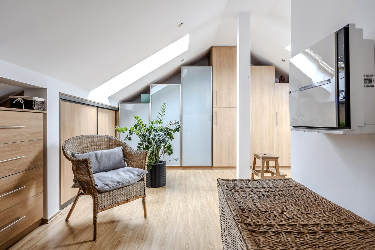 Klimatyzacja, okna dachowe z widokiem na niebo oraz liczne schowki pod skosami.