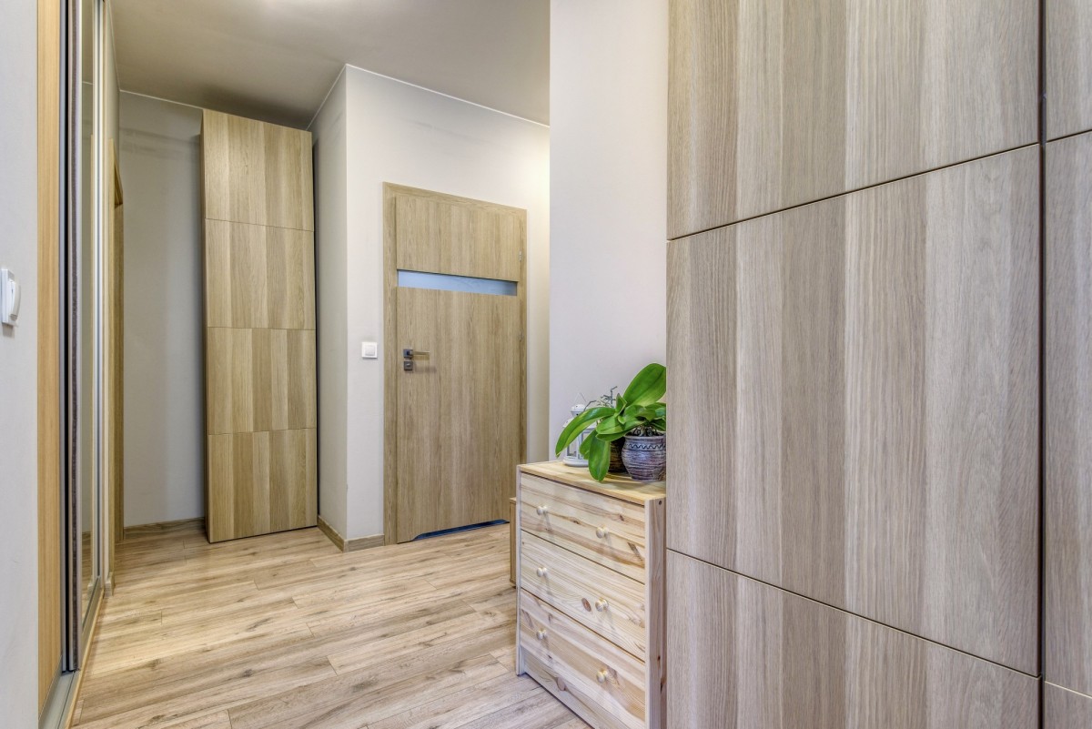 Sypialnia o powierzchni 9,53 m² ma kształt kwadratu, co czyni ją wyjątkowo ustawną i pozwala na swobodną aranżację wnętrza. Komfort dopełnia przestronny korytarz (9,72 m²), który umożliwia wygodne rozmieszczenie szaf i zapewnia poczucie przestrzeni. Łazienka o powierzchni 5,73 m² jest utrzymana w nowoczesnym stylu i nie wymaga żadnych nakładów finansowych.