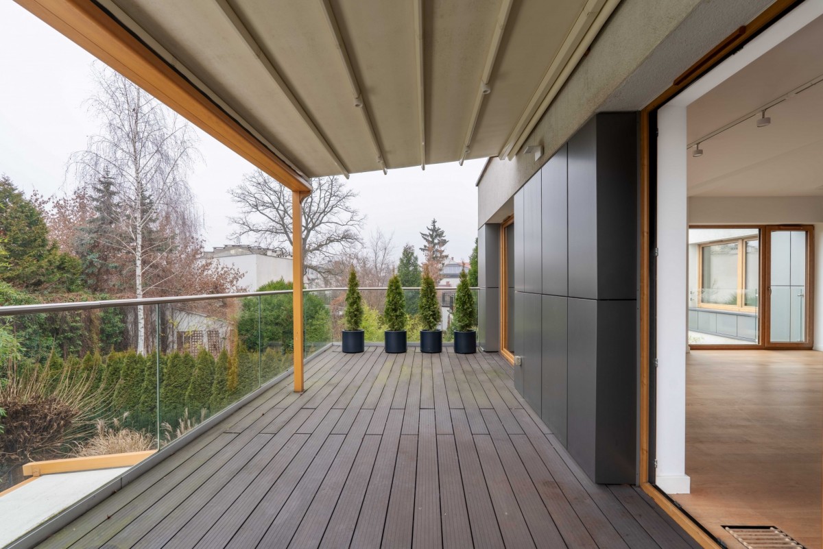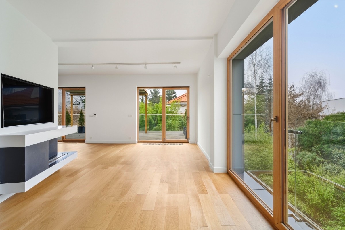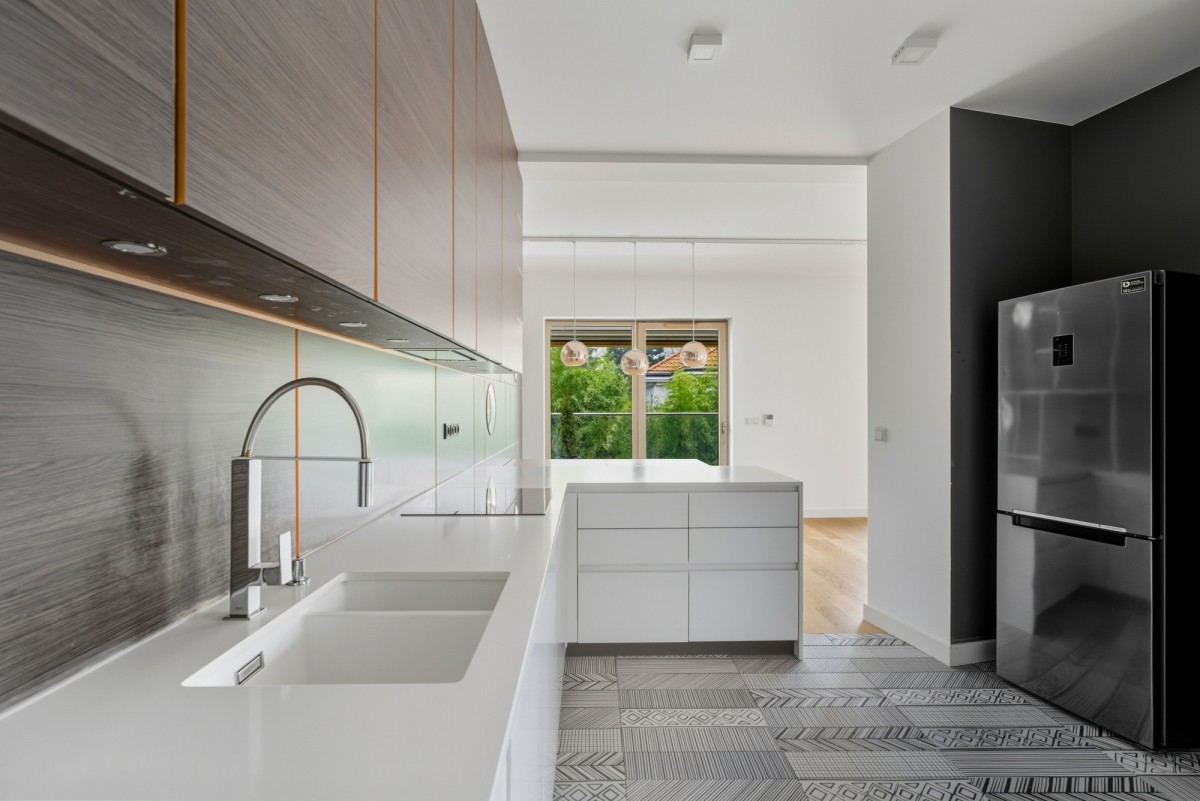 Sercem domu jest przestronny i słoneczny salon z aneksem kuchennym, który dzięki dużym przeszkleniom jest wypełniony światłem przez cały dzień. Wyjątkowy klimat tworzą wysokie sufity (290 cm)