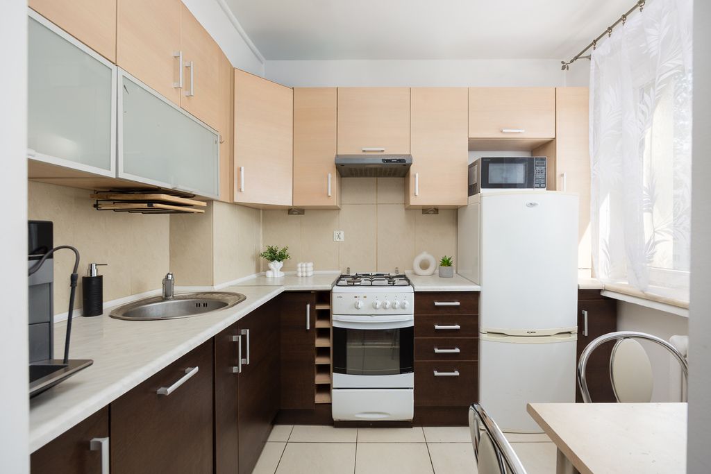 - oddzielnej, widnej kuchni z pełnym AGD (lodówka, zmywarka, piekarnik, mikrofalówka, kuchenka gazowa, okap),