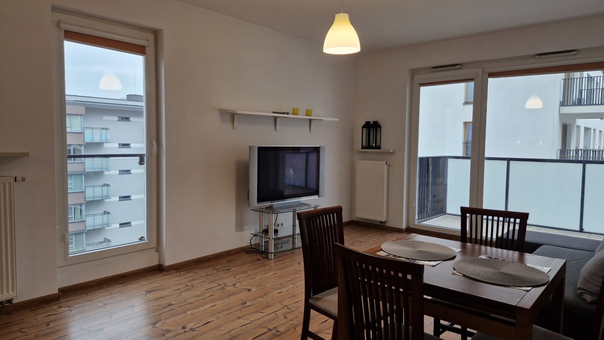 Mieszkanie jest jasne, przestronne. Składa się z częściowo otwartej widnej kuchni , dużego salonu z którego jest wyjście na taras-balkon, dwóch sypialni, łazienki z wanną , oddzielnego wc, przestronnego przedpokoju z dwoma szafami wnękowymi.
