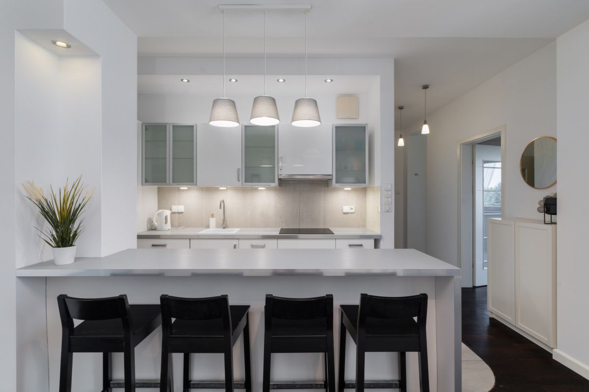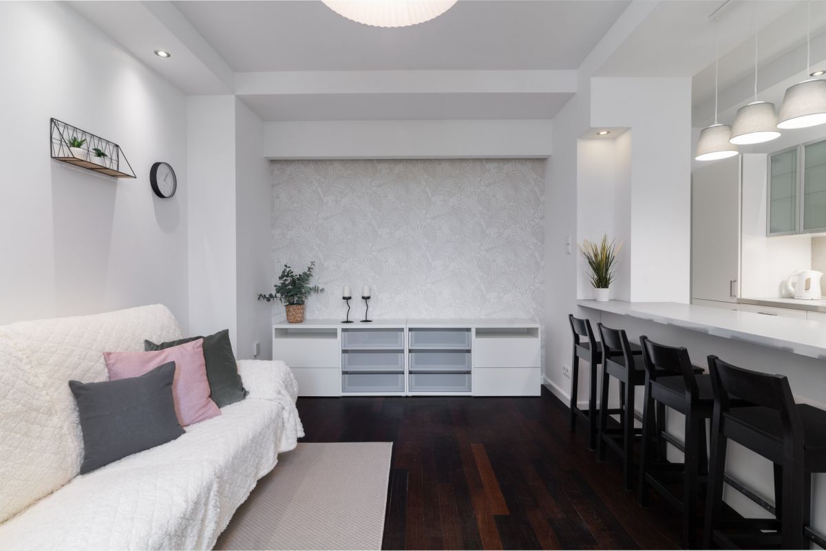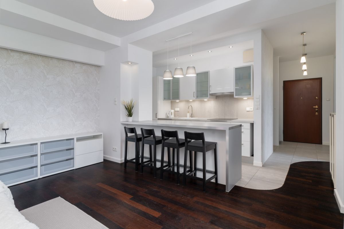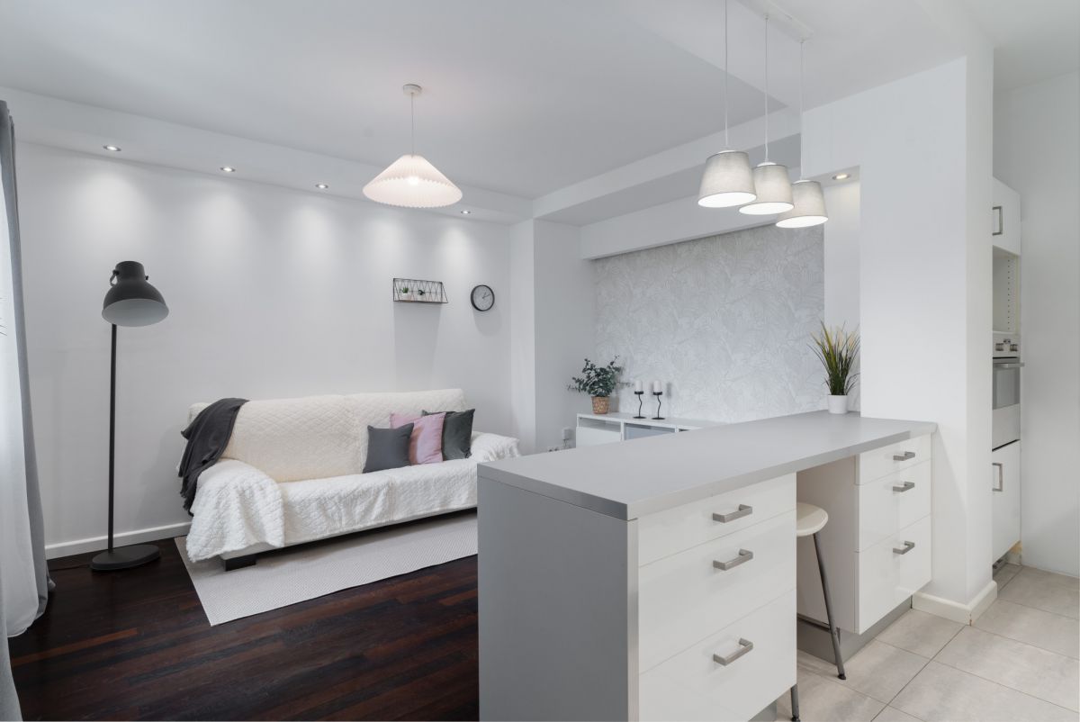 * Salon z aneksem kuchennym - funkcjonalna, otwarta przestrzeń dzienna,