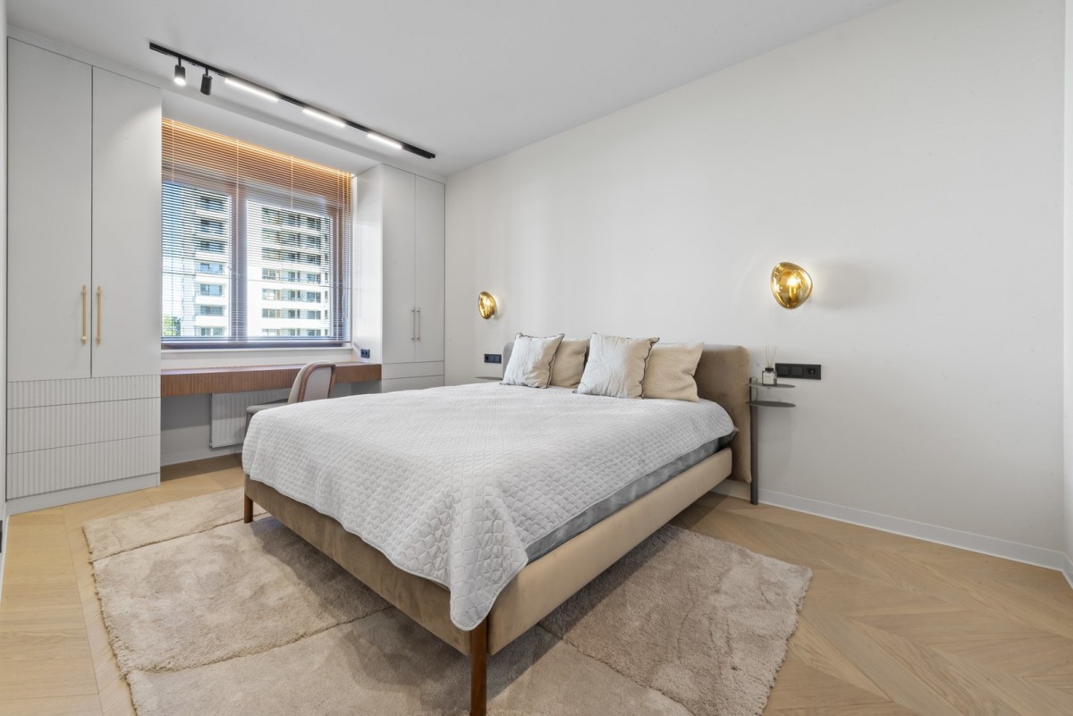 Mieszkanie wykończone w standardzie premium. Drewniane podłogi. Meble wykonane na zamówienie lub znanych włoskich producentów. AGD niemieckich marek, klimatyzacja, podgrzewaną podłoga. Szafy w zabudowie. Armatura łazienkowa premium. Mieszkanie projektowane przez architekta.