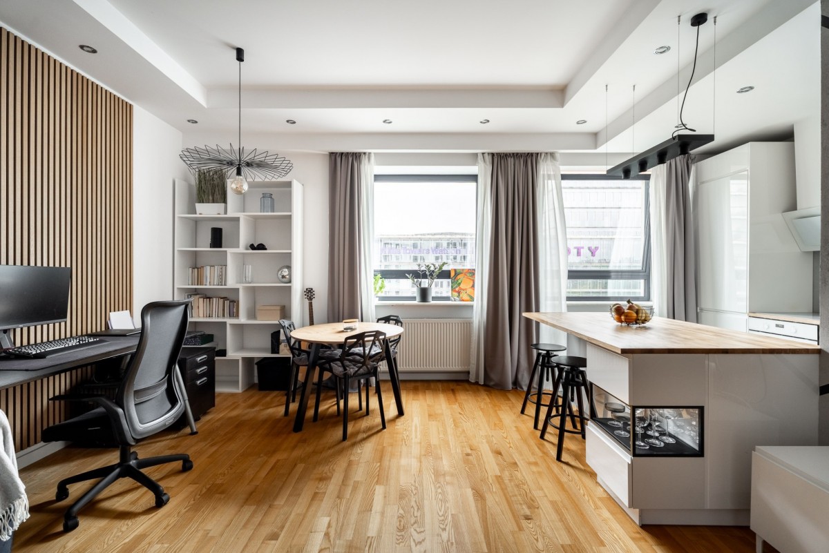 * przestronny salon z miejscem na sofę i wyspą kuchenną