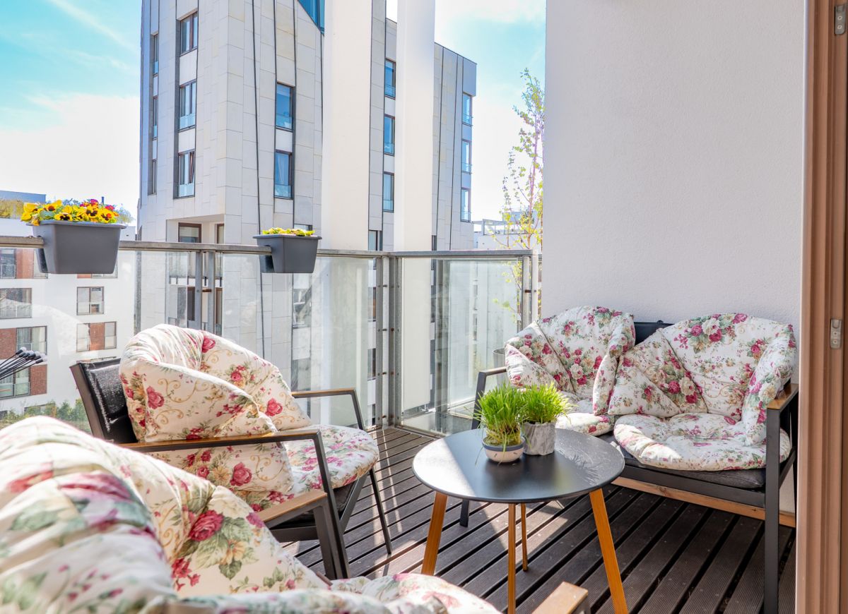 - Trzy zewnętrzne donice na roślinność z automatycznym systemem podlewania - w ramach czynszu