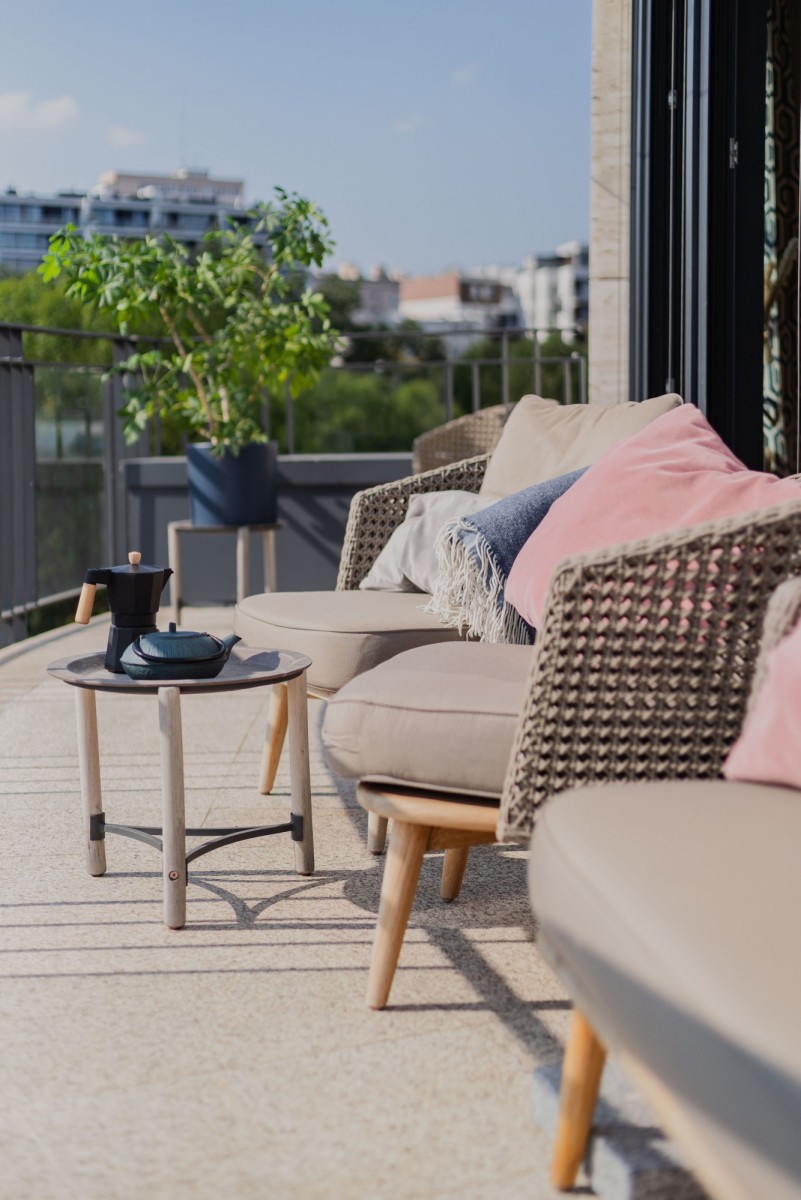 Tarasy apartamentu oferują widok na zielone, spokojne otoczenie Mokotowa.