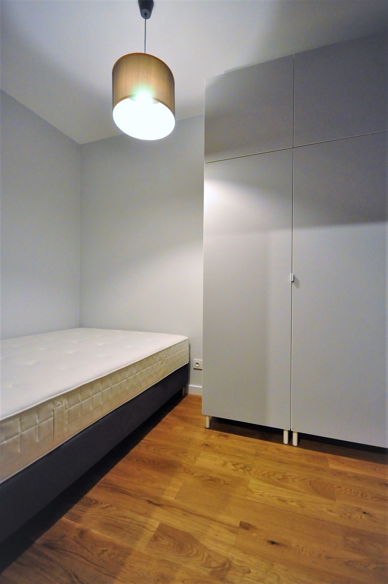 Mieszkanie jest wykończone w dobrym standardzie. Łazienka z kabiną prysznicową (brodzik Roca, szary konglomerat 140x80), na ścianach szary gres, armatura i stelaż Geberit/Hansgrohe, w całym mieszkaniu jest parkiet dębowy, okna drewniane trzyszybowe. W mieszkaniu jest wydzielona sypialnia. Meble: w sypialni łóżko 140x200, szafa. W salonie z aneksem kuchennym kanapa rozkładana, szafka/komoda RTV, meble kuchenne z AGD - duża lodówka, płyta indukcyjna, okap, piekarnik, zmywarka.