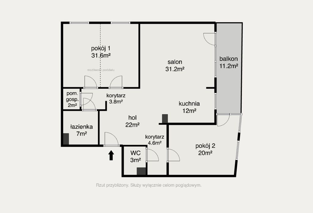 - Pokój I – 36,1 m² – według pierwotnego planu były tam 2 pokoje i jest możliwość przywrócenia go na dwa pomieszczenia po ok 15 m²
