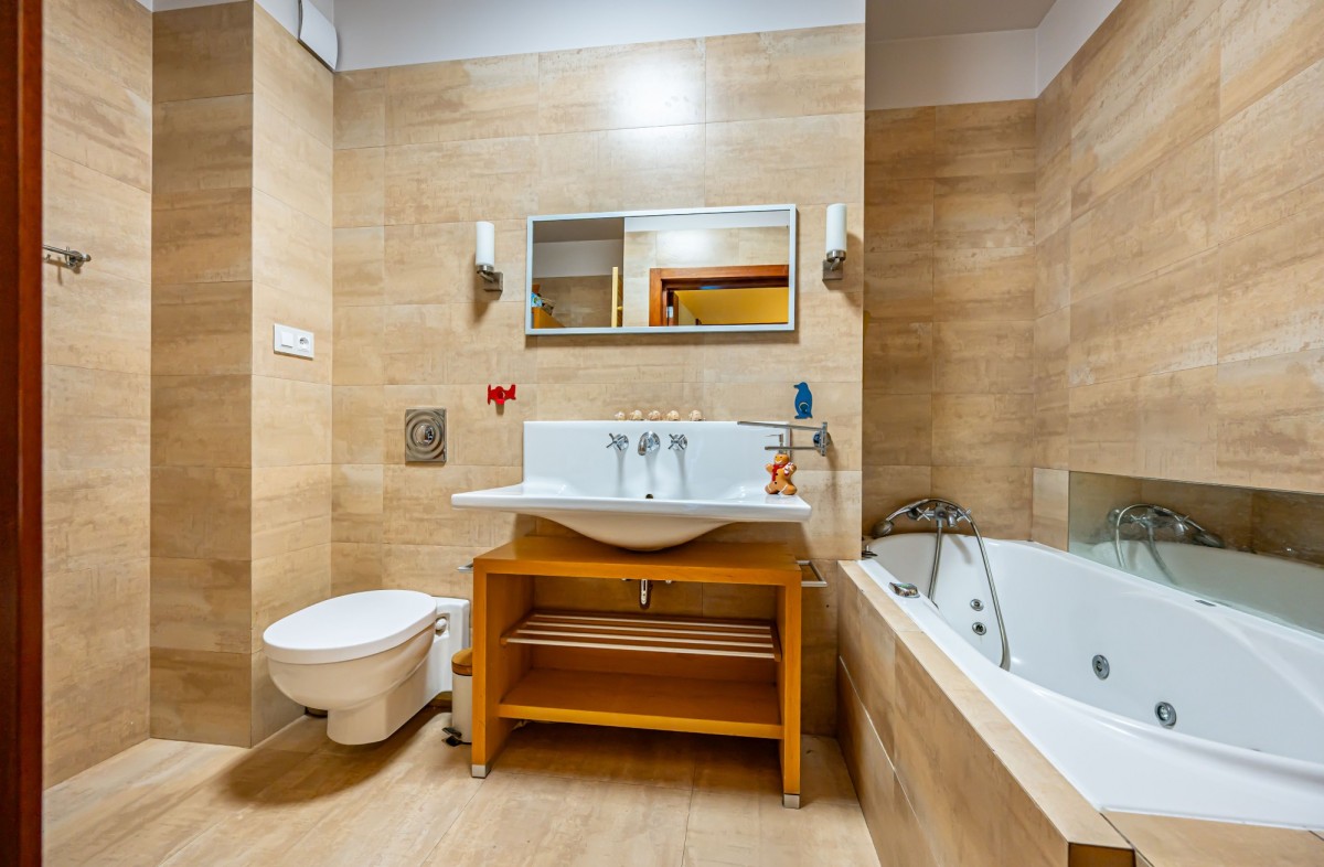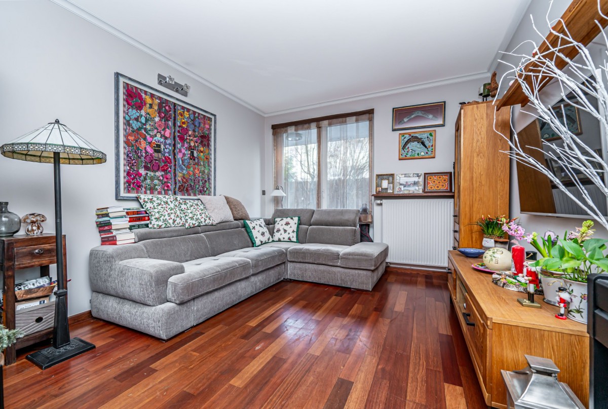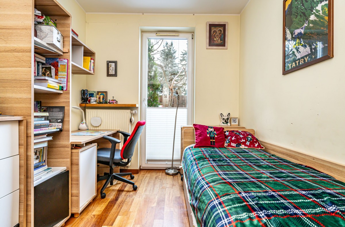Mieszkanie jest przestronne, składa się z osobnej kuchni z oknem, salonu z wyjściem na ogród dwóch sypialni oraz dwóch łazienek ( jedna z wanną a druga z prysznicem). Dodatkowym atutem mieszkania jest wiele miejsc do przechowywania rzeczy.