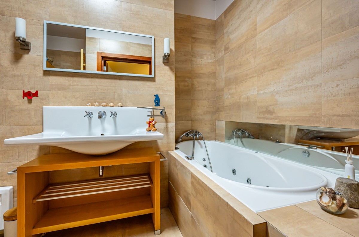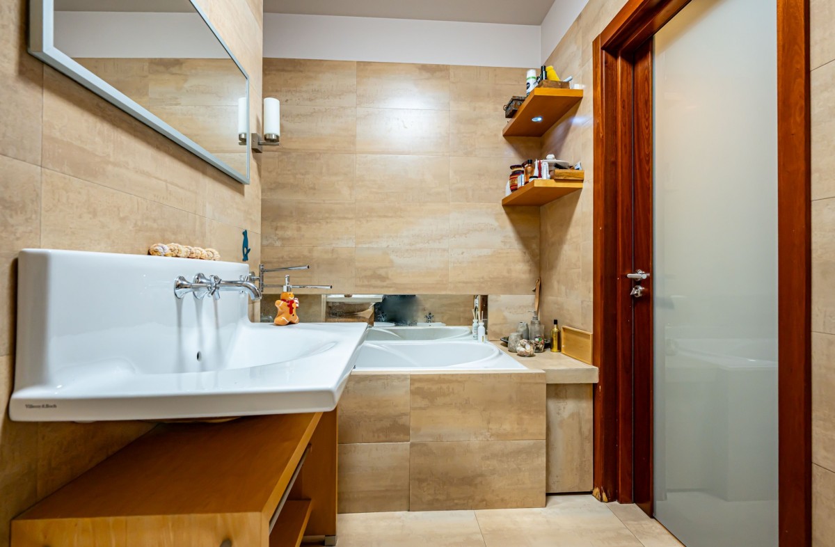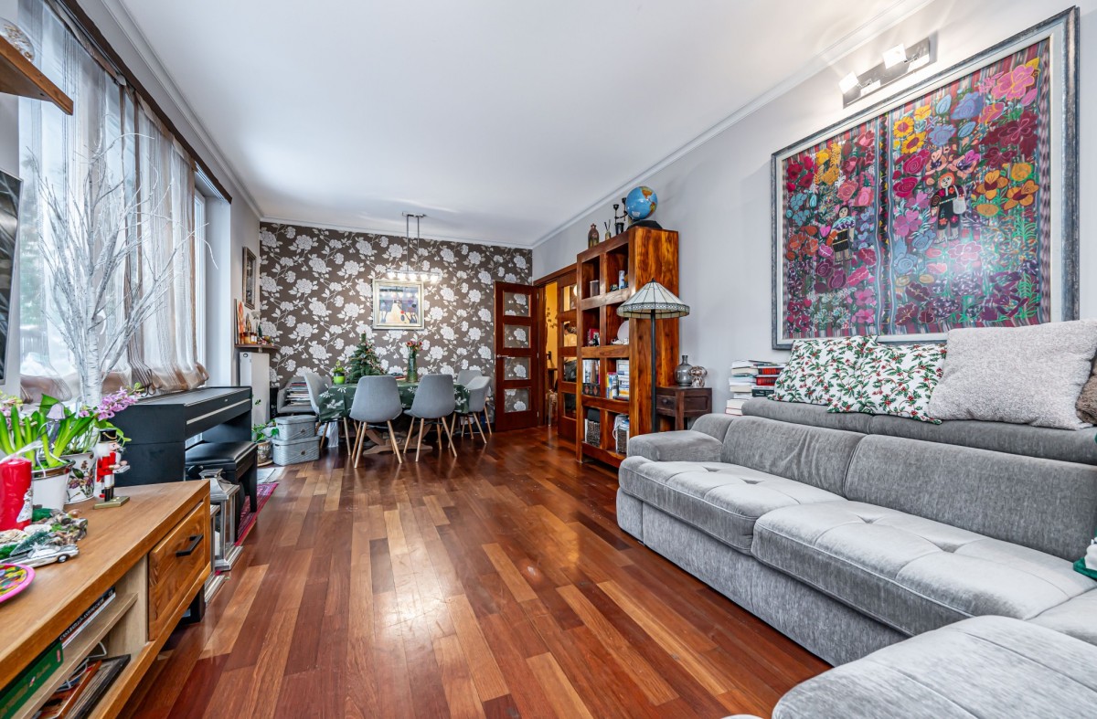 Mieszkanie wymaga odświeżenia, ale wykonane było z wysokiej jakości materiałów, drewniana podłoga, granitowe blaty kuchenne.