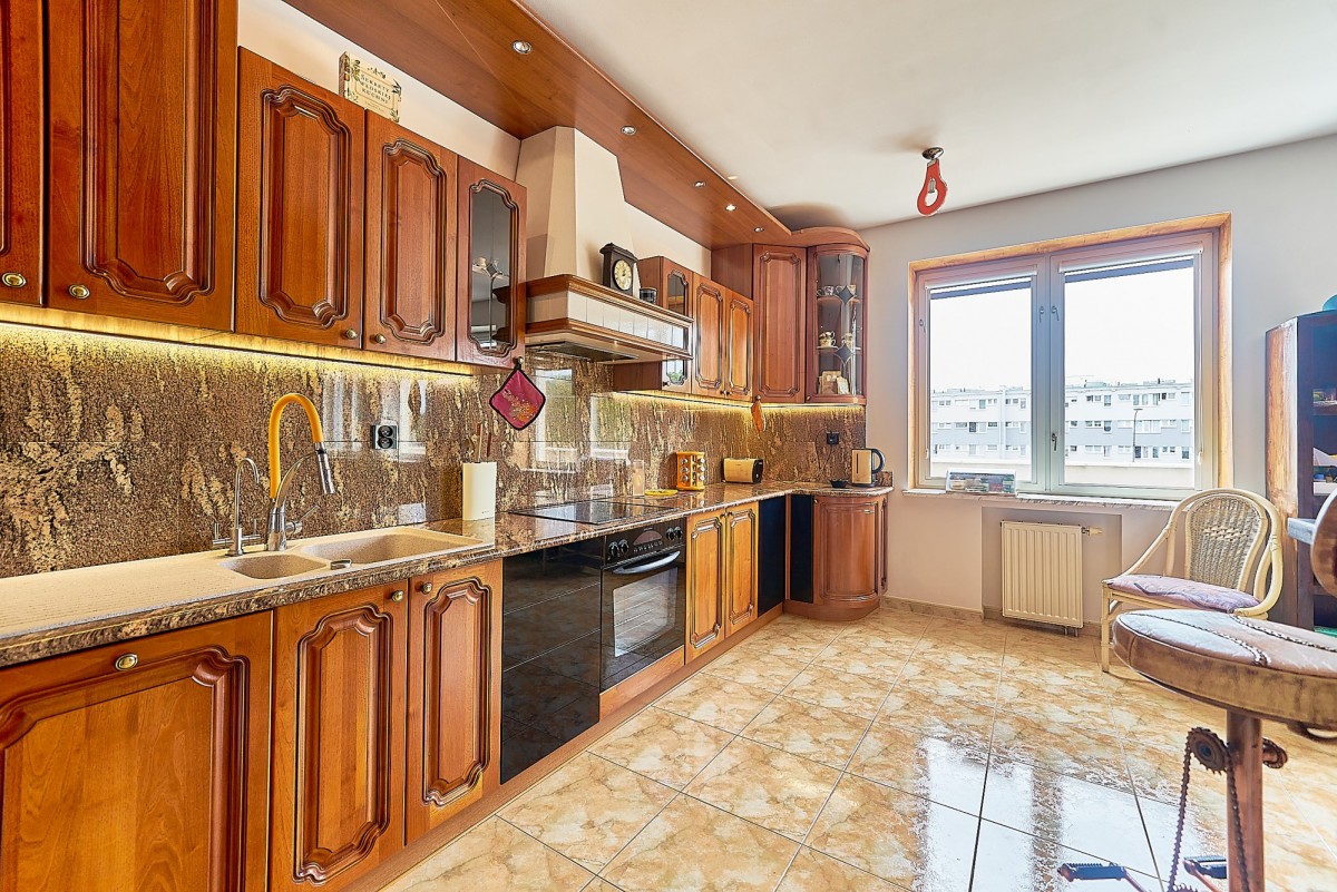 Na podłogach znajdują się parkiet oraz płytki ceramiczne, a kuchnia wyposażona jest w drewnianą zabudowę.