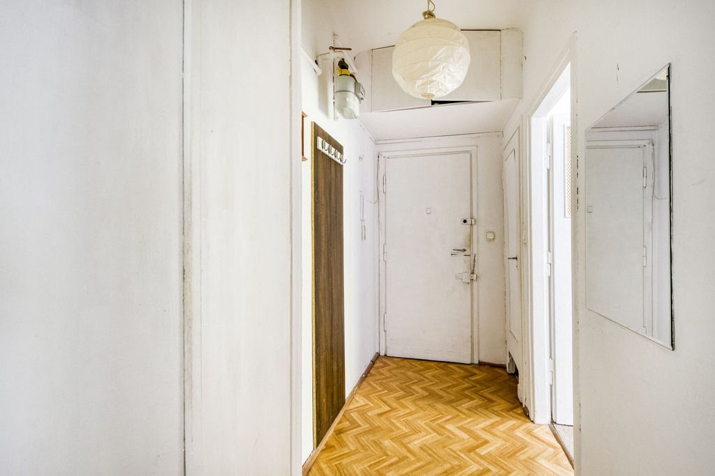 Na podłodze w większym pokoju i pokoju obok aneksu kuchennego zachowany jest oryginalny parkiet, który wymaga renowacji.