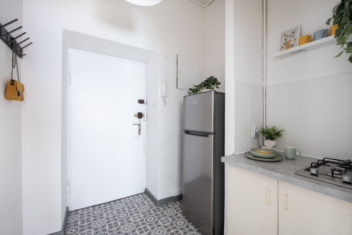 Do mieszkania wchodzi się z zamykanego przedsionka, który stanowi część wspólną dla jeszcze jednego lokalu.