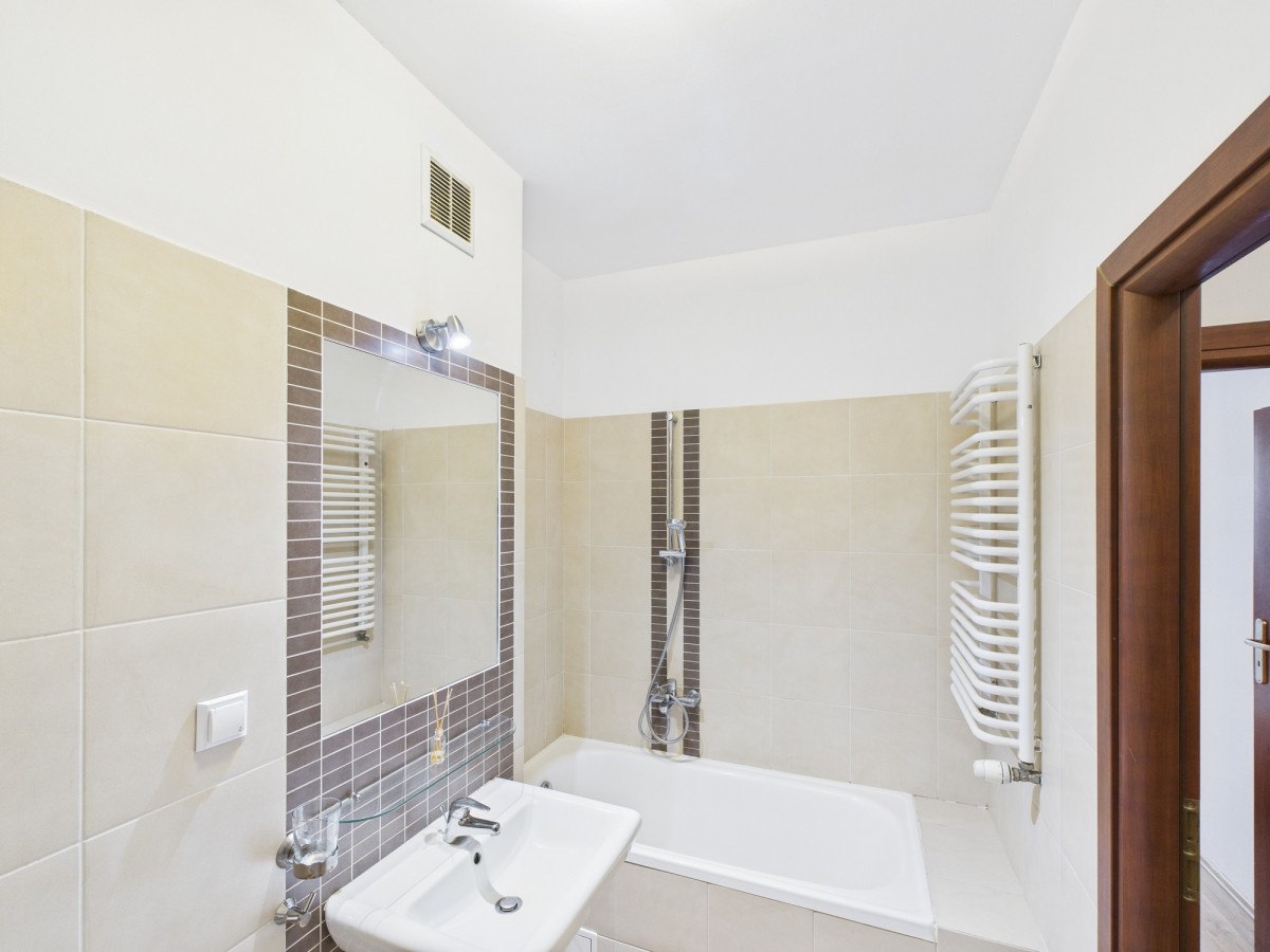 łazienka: wyposażona w wannę, umywalkę, WC i pralkę
