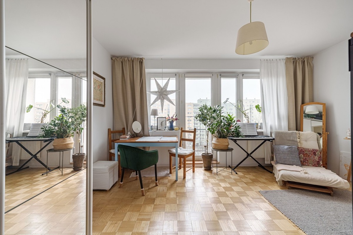 Nieruchomość znajduje się na siódmym piętrze z dziesięciu w zadbanym i modernizowanym budynku z 1989. Mieszkanie jasne, z okien rozpościera się widok na korony drzew.