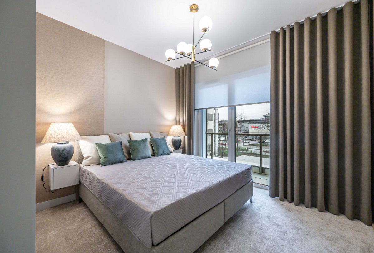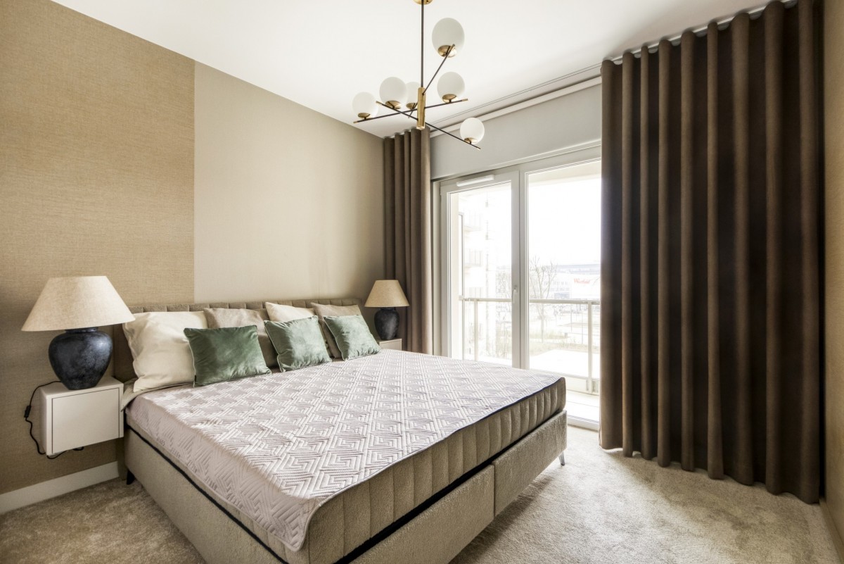 - Przemyślana aranżacja sypialni - tapicerowane łóżko kontynentalne, panele ścienne oraz subtelne oświetlenie tworzą przytulny, luksusowy klimat.
