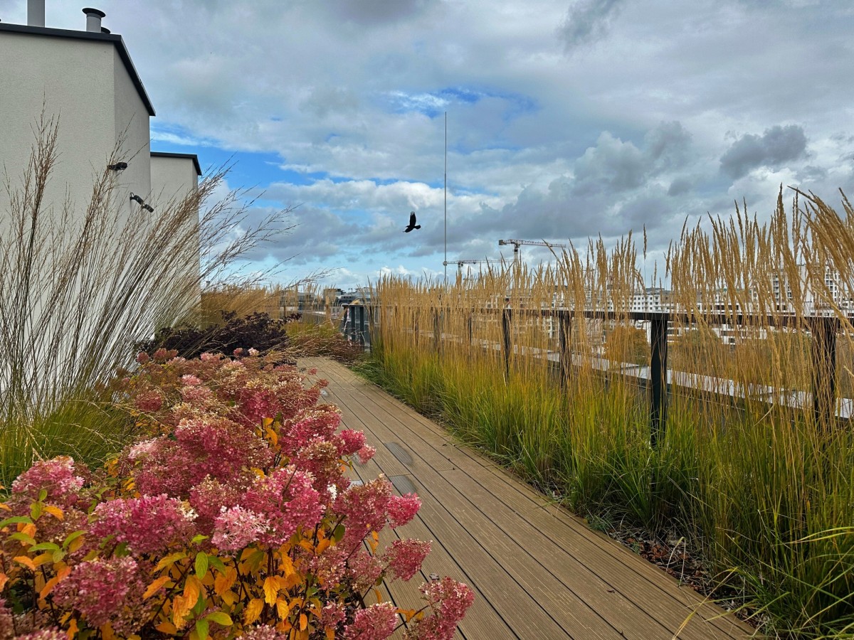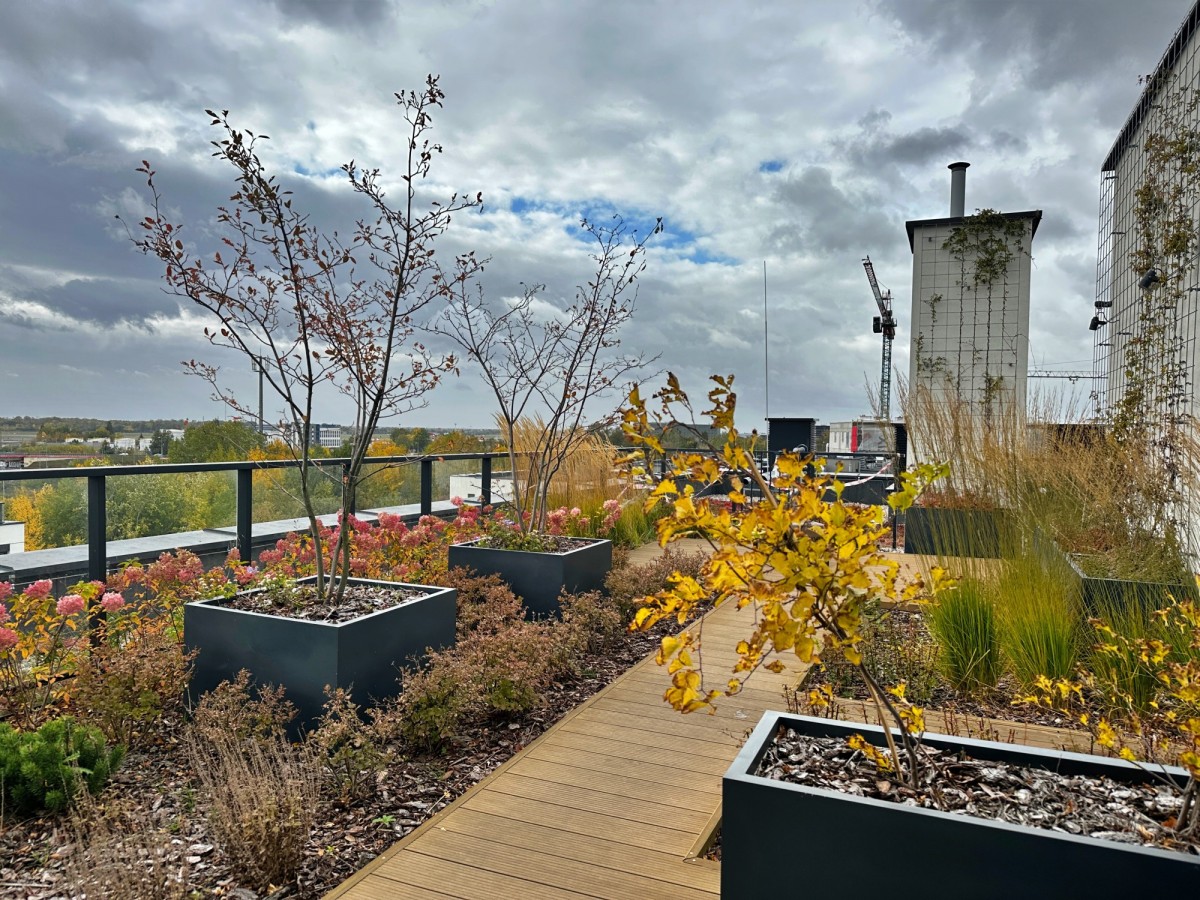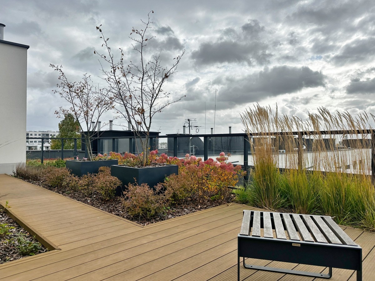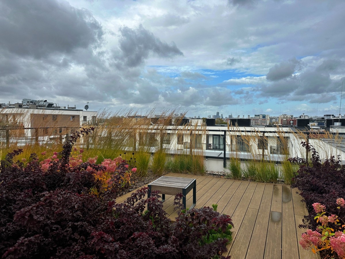 Na dachu znajduje się przestronne, zielone patio z widokiem na panoramę miasta, wieżowce i lotnisko — idealne miejsce do odpoczynku z możliwością obserwowania startujących i lądujących samolotów.