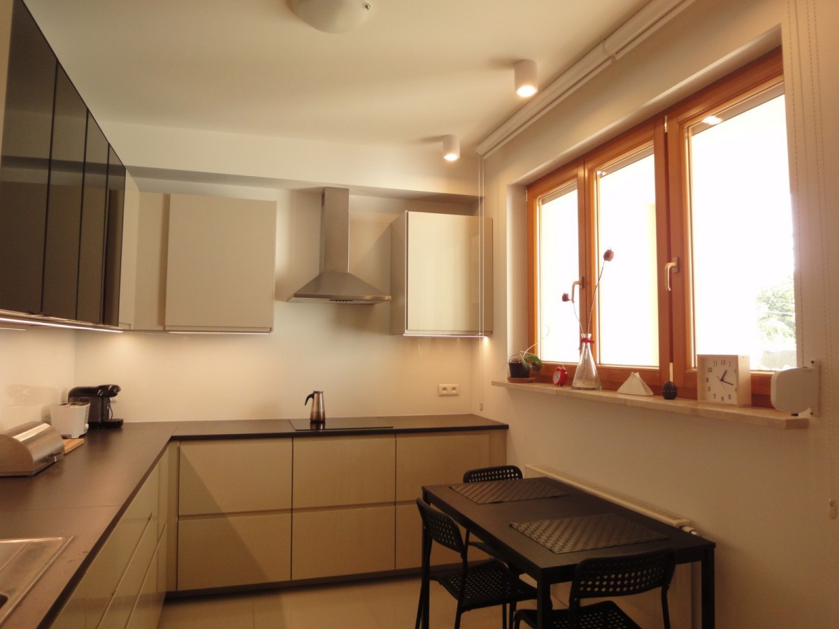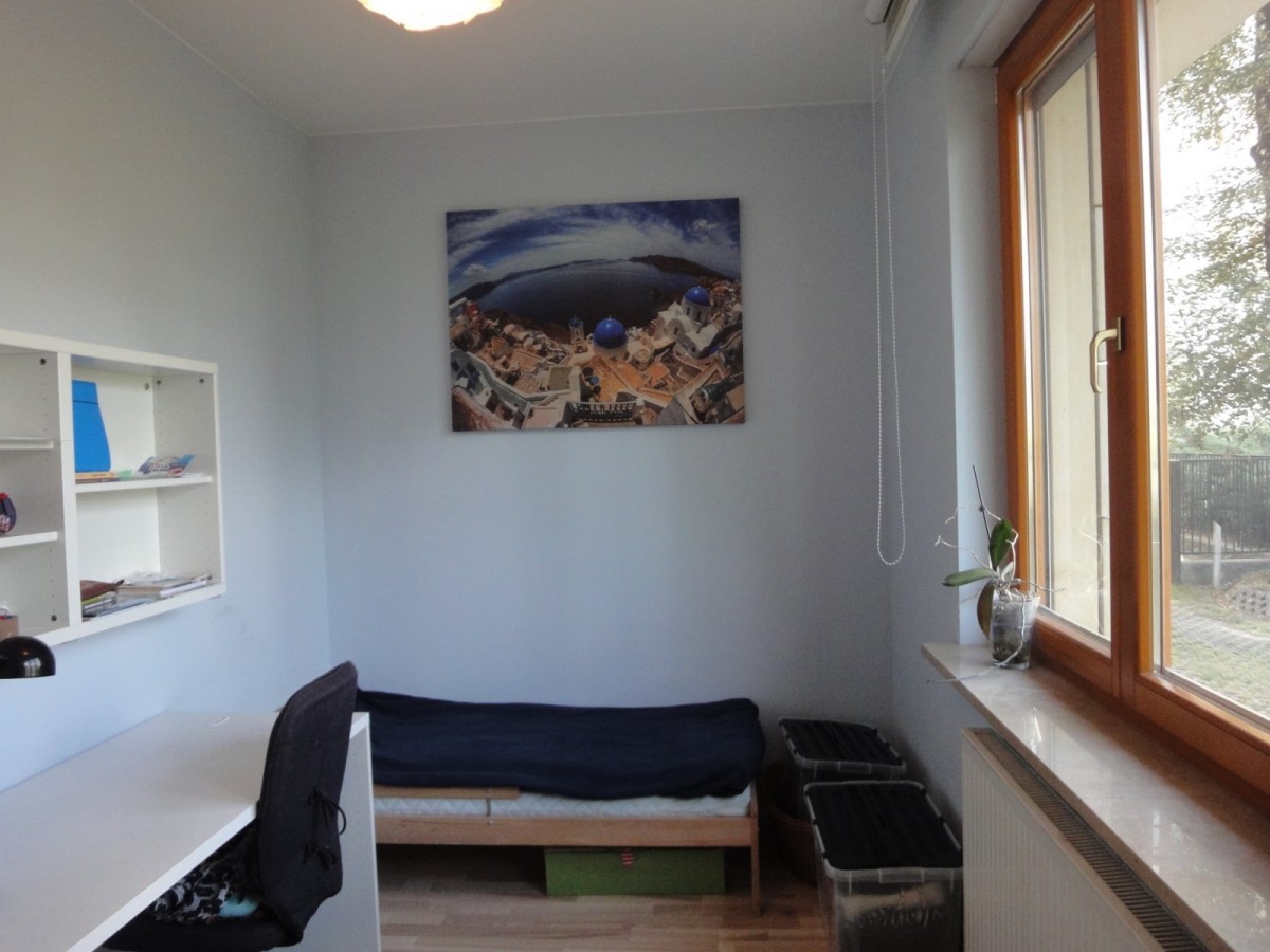 Szerzej - znajdziemy tu pokój dzienny z wyjściem na loggię, ogromną oddzielną kuchnię z miejscem na rodzinne posiłki (okna na zachód), trzy regularne sypialnie (wszystkie na wschód), łazienkę z wc (wanna ze szklanym parawanem), dodatkową oddzielną toaletę i przedpokój z niewielką garderobą.