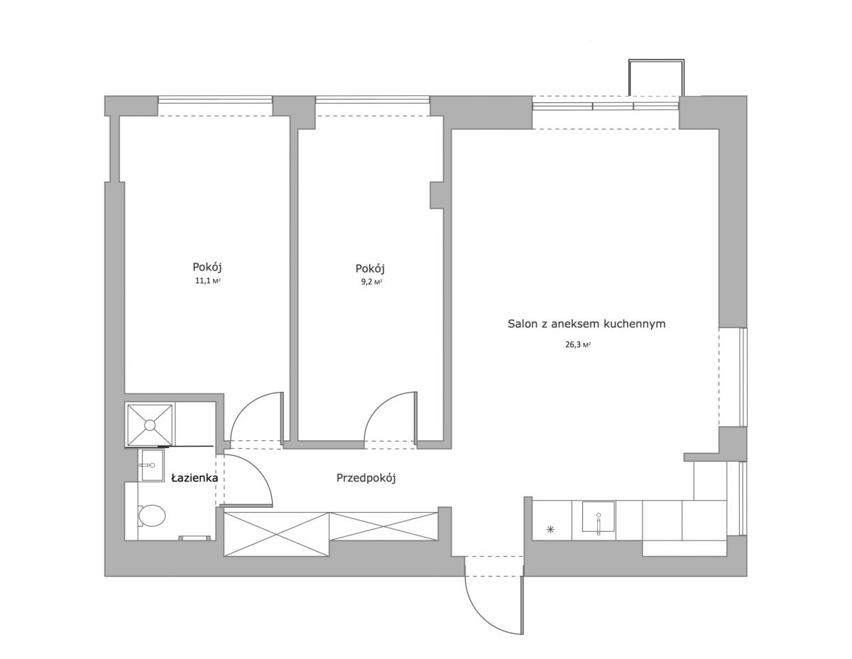 Mieszkanie o powierzchni 57,2 m² składa się z: