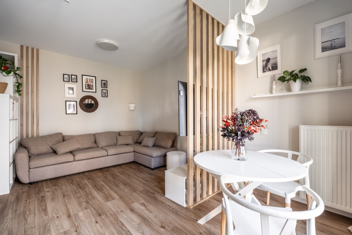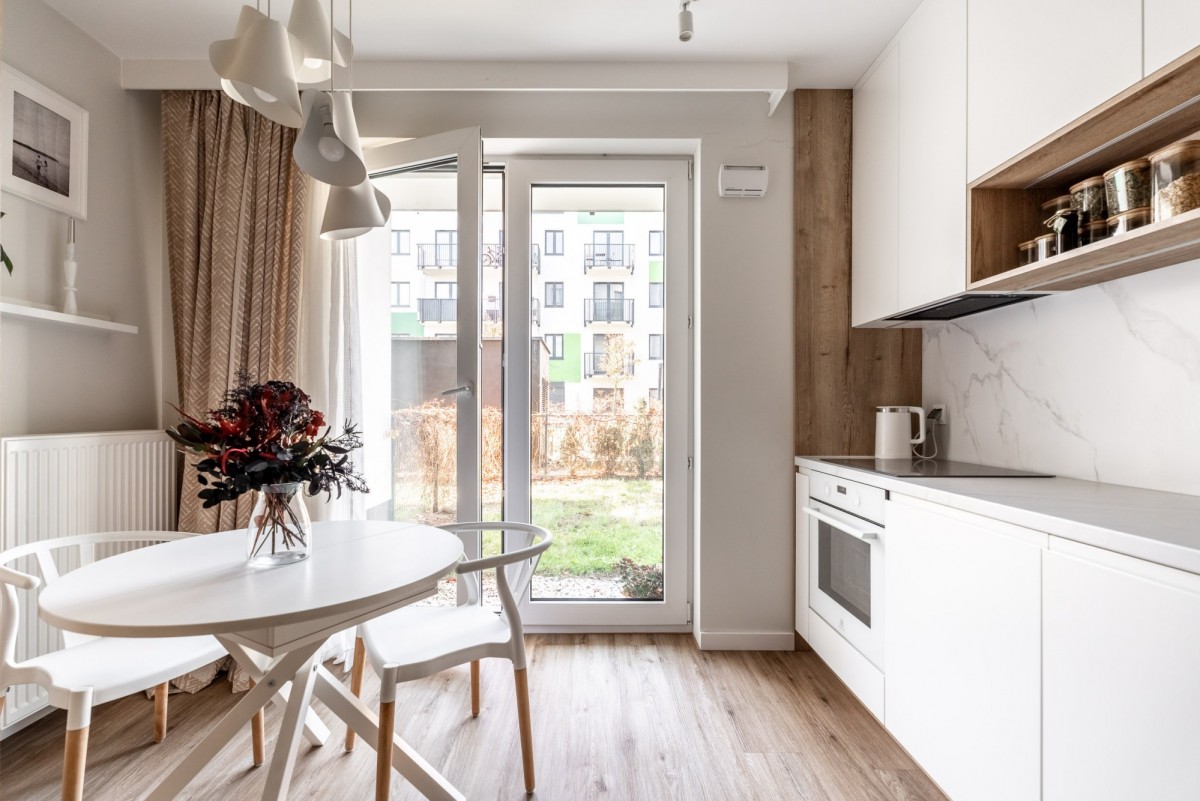 Mieszkanie o powierzchni 47 m² na parterze nowoczesnego budynku - salon z aneksem kuchennym 18 m²,
