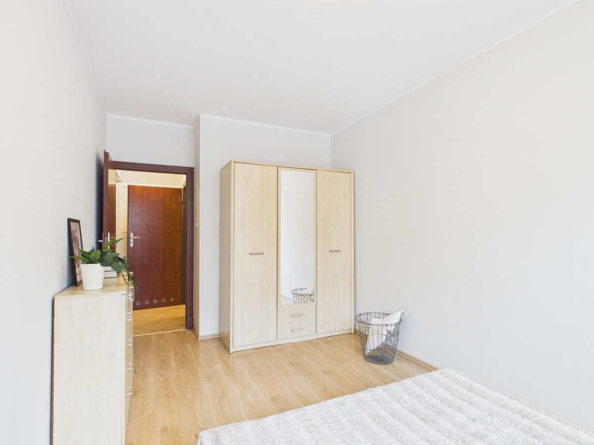 - sypialnia wyposażona w duże łóżko dwuosobowe oraz pojemną szafę