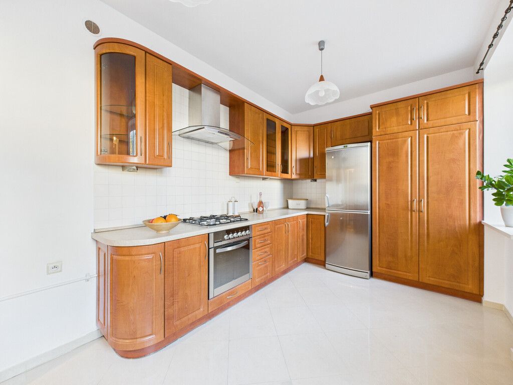 Kuchnia jest wyposażona w meble oraz sprzęt AGD: lodówkę, zmywarkę, płytę gazową, piekarnik, okap.
