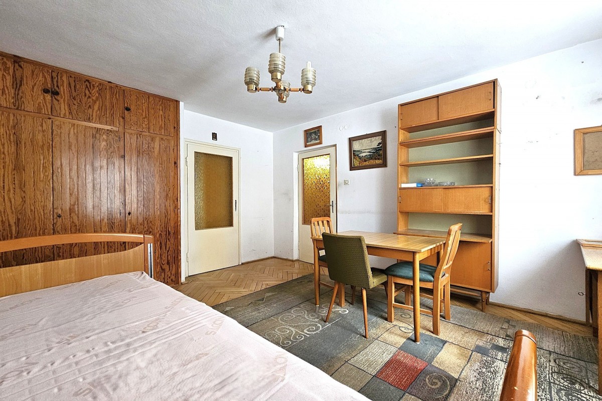 Mieszkanie kiedyś luksusowe z prawdziwą dębową jodełką i boazerią, dziś do kapitalnego remontu. Składa się z dwóch pokoi o pow. ok 20 i 17m, widnej kuchni 7,7m, łazienki 3,5m i przedpokoju. Jest dwustronne z ekspozycją południowy-wschód - północny-zachód. Do mieszkania przynależy piwnica o pow. 5,4m.