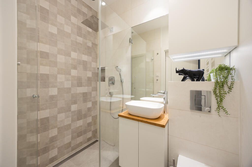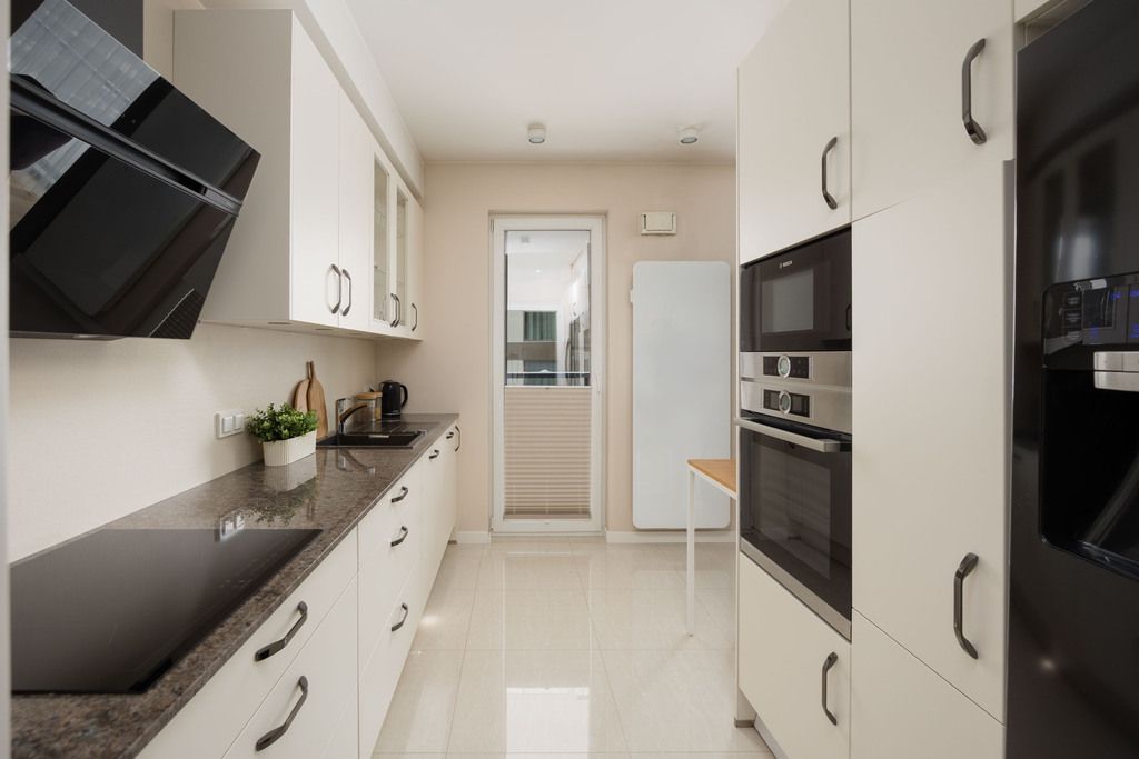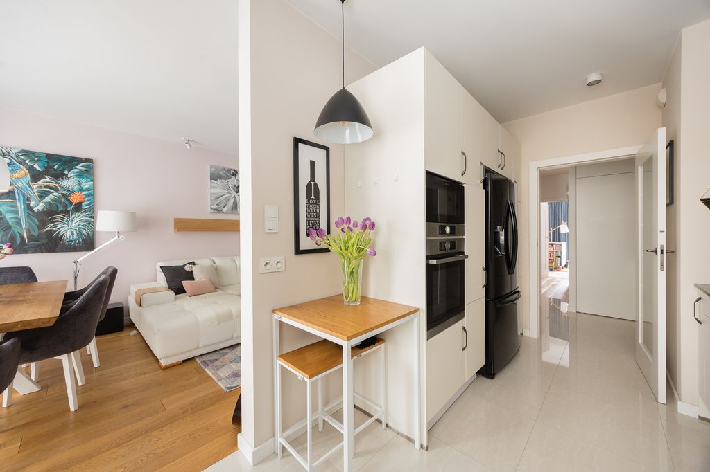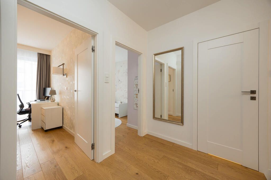 wysokiej jakości okna aluminiowe oraz PCV i drzwi antywłamaniowe. Na podłodze deska dwuwarstwowa z dębu naturalnego, a w kuchni i łazienkach płytki. Kuchnia w pełni wyposażona w sprzęt AGD, m.in. lodówka typu french door, piekarnik parowy, płyta indukcyjna. Wszystkie sprzęty sprawne, w dobrym stanie.