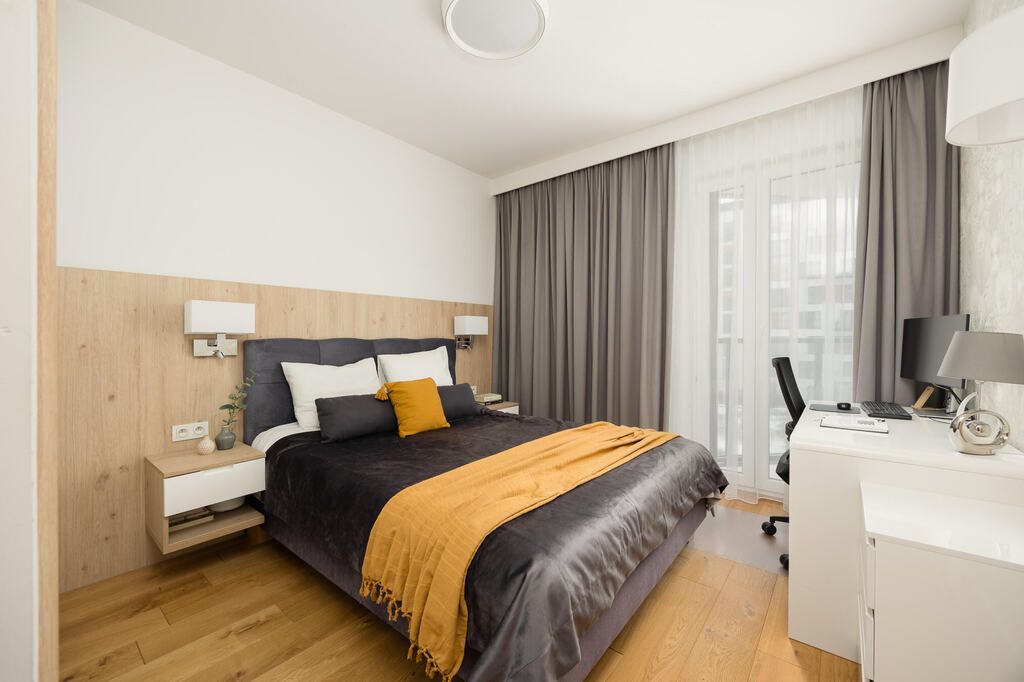 - sypialnia z wejściem na balkon i dużą szafą wnękową
