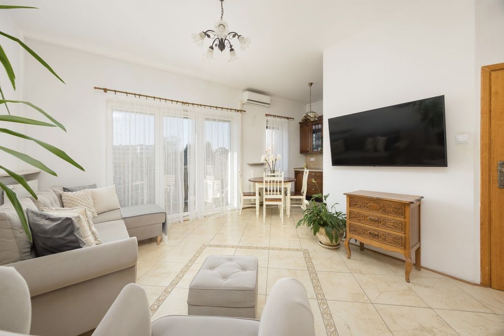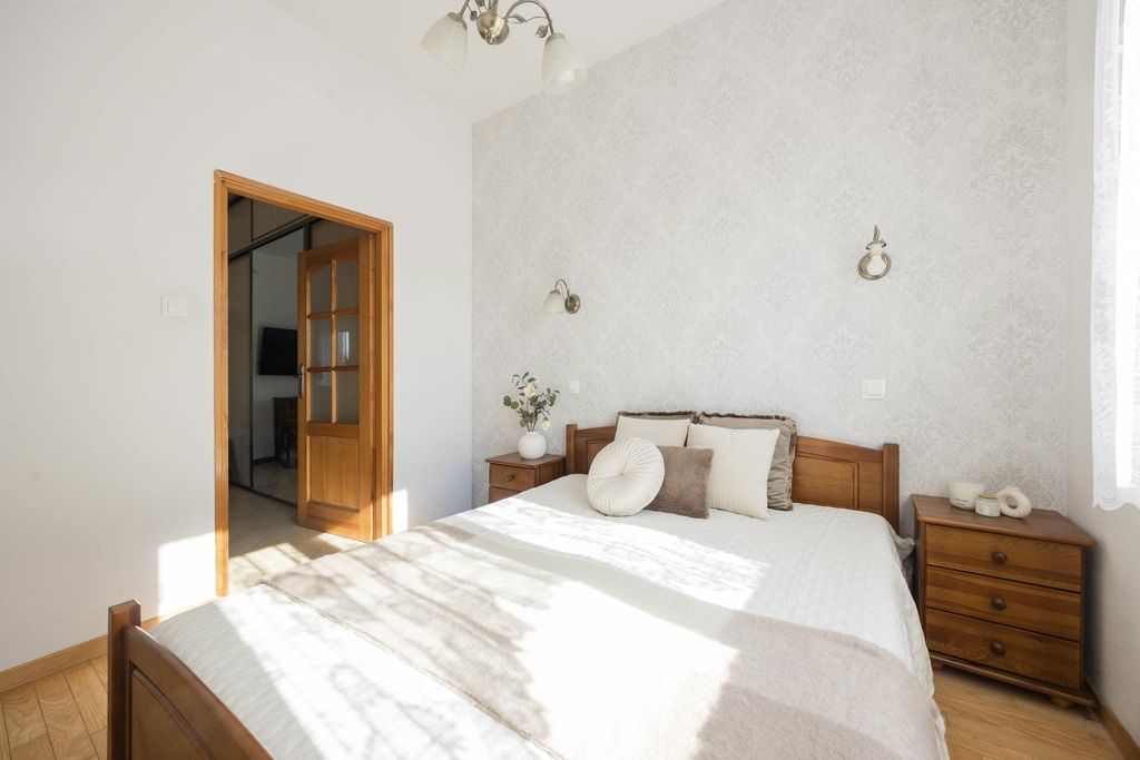 Mieszkanie w dobrym stanie wizualnym i technicznym, kupione od dewelopera w 2014 roku, wykończone w klasycznym i ponadczasowym stylu. Dużą ilość naturalnego światła zapewnia najbardziej pożądana południowo - zachodnia ekspozycja. Drzwi wejściowe antywłamaniowe, domofon. Na podłogach w salonie i kuchni gres, w pokojach parkiet z naturalnego drewna, w łazience płytki. Salon łączy funkcję wypoczynkową i jadalnianą, wraz z otwartą kuchnią i wyjściem na słoneczny balkon. W salonie znajduje się duża szafa z przesuwanymi drzwiami wykonana na wymiar przez stolarza. W pełni wyposażona kuchnia, meble z frontami z naturalnego drewna oraz sprzęt AGD marki Beko, między innymi płyta indukcyjna (nowa, 2025r.), zmywarka (nowa, 2025r.), piekarnik, lodówka z zamrażarką. Dwa kolejne pokoje pełnią obecnie funkcję głównej sypialni oraz pokoju dziecka; możliwość zaaranżowania według własnych potrzeb, na przykład jako gabinet. W łazience znajduje się narożna wanna, meble i toaleta. Dużym atutem mieszkania jest zlokalizowanie w części osiedla oddalonej od ulicy, mieszkanie jest bardzo ciche. W mieszkaniu zamontowano system klimatyzacji, który zapewnia komfort mieszkańcom podczas letnich dni; klimatyzacja jest regularnie serwisowana. Wysokie pomieszczenia, ponad 3m.