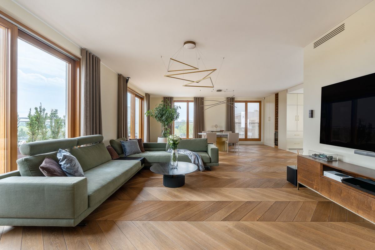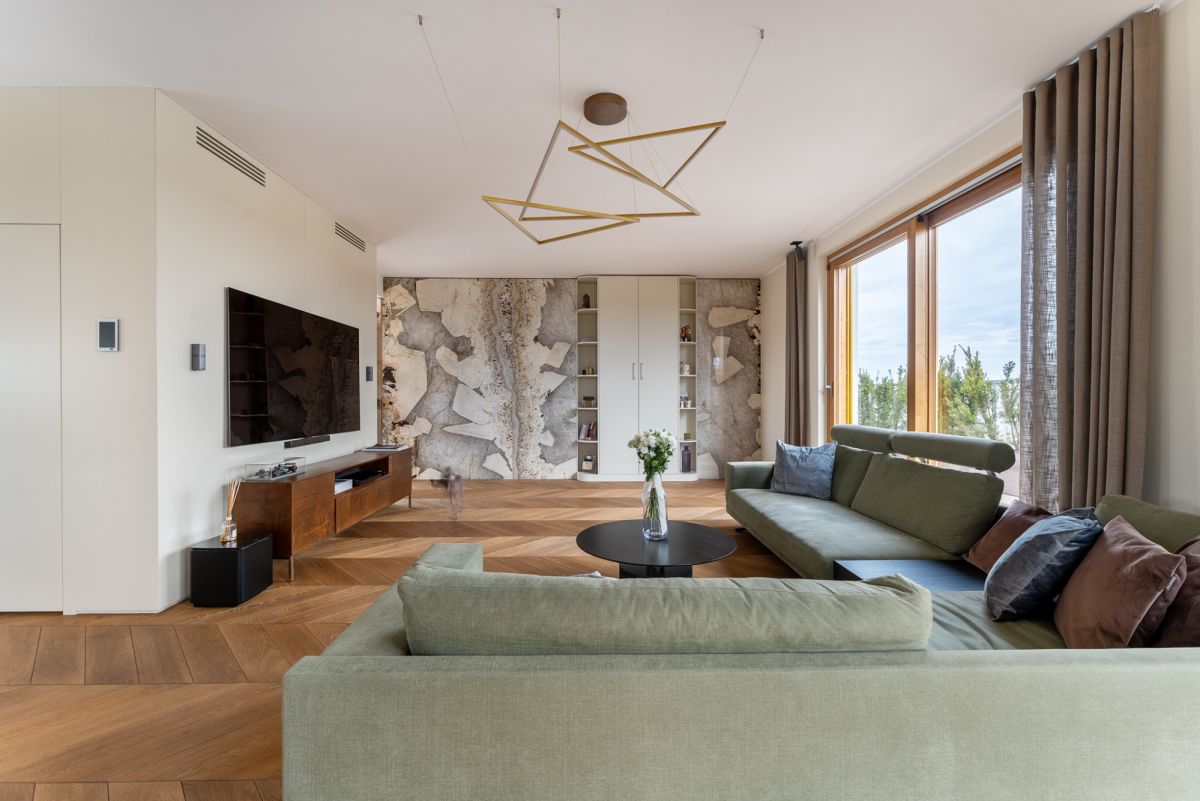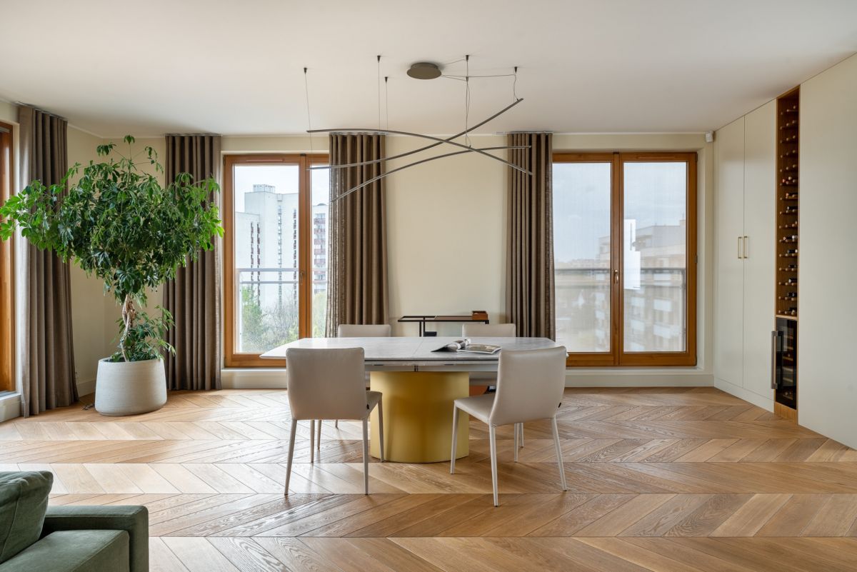 Eleganckie meble oraz dbałość o szczegóły wykończenia zapewniają wygodę i komfort, a spójna kolorystyka i możliwość sterowania natężeniem oświetlenia tej części mieszkania, sprzyjają atmosferze wyciszenia i relaksu. Panoramiczne, duże okna drewniane w systemie przesuwnym HS oraz ekspozycja na trzy strony świata: wschód południe i zachód czynią wnętrze bardzo jasnym i dobrze doświetlonym.