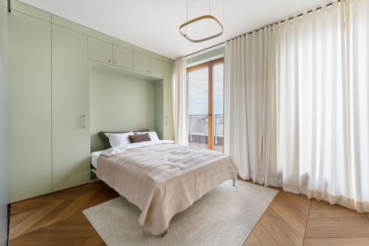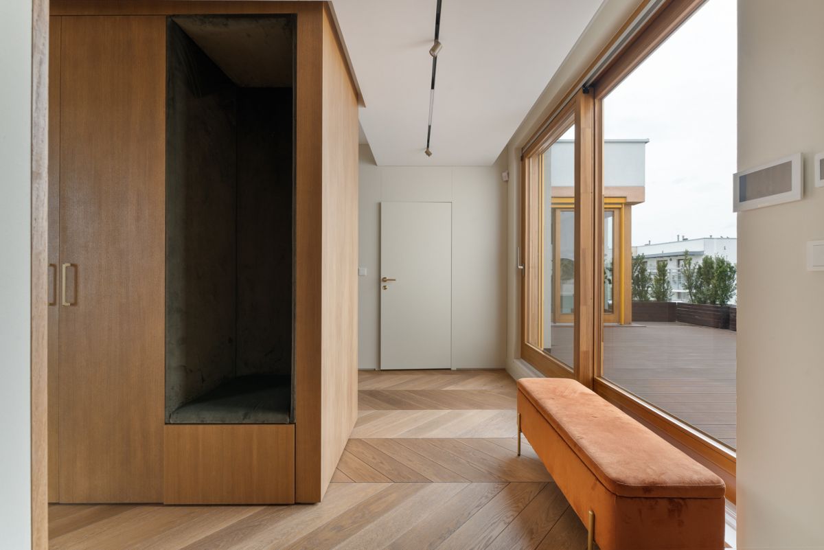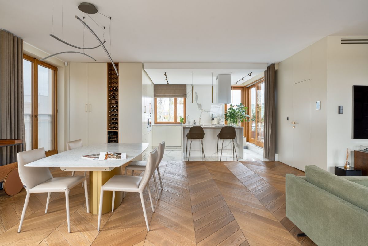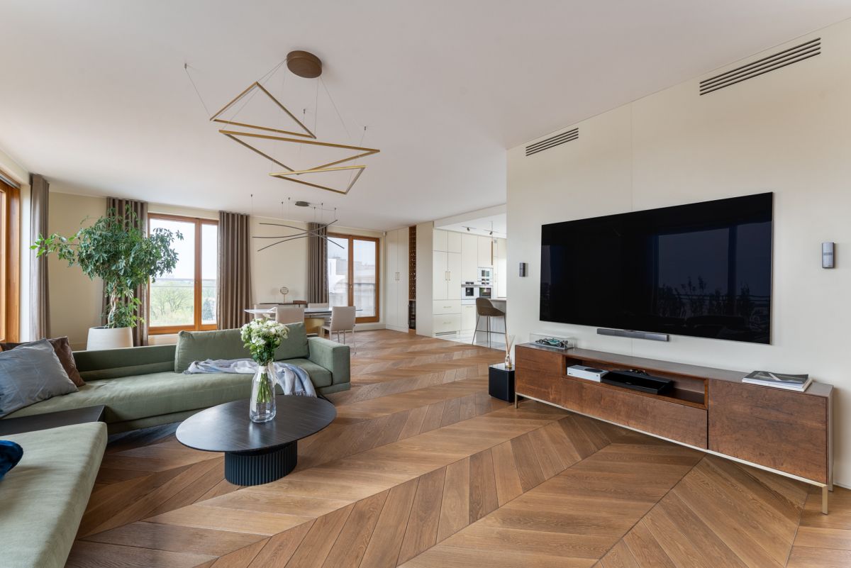 Eleganckie meble oraz dbałość o szczegóły wykończenia zapewniają wygodę i komfort, a spójna kolorystyka i możliwość sterowania natężeniem oświetlenia tej części mieszkania, sprzyjają atmosferze wyciszenia i relaksu. Panoramiczne, duże okna drewniane w systemie przesuwnym HS oraz ekspozycja na trzy strony świata: wschód południe i zachód czynią wnętrze bardzo jasnym i dobrze doświetlonym.