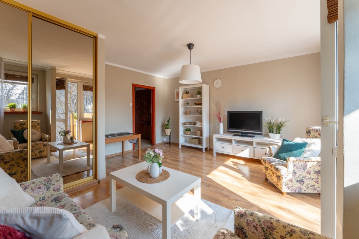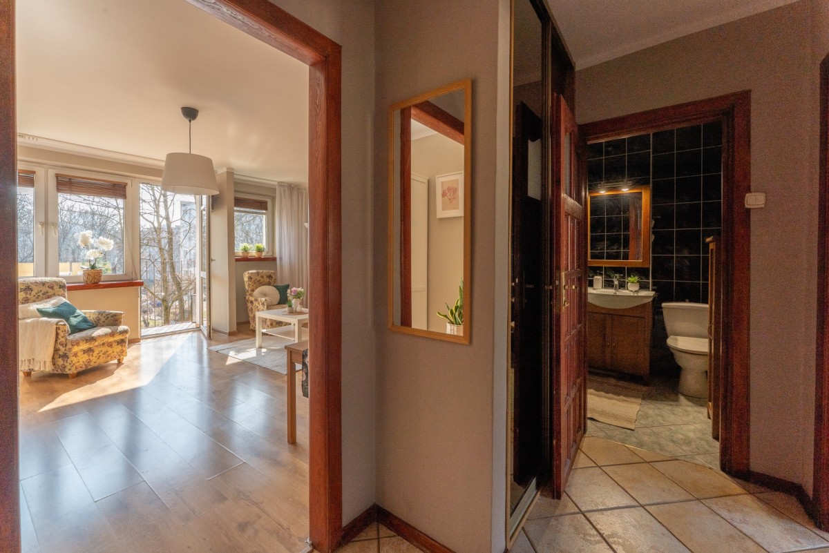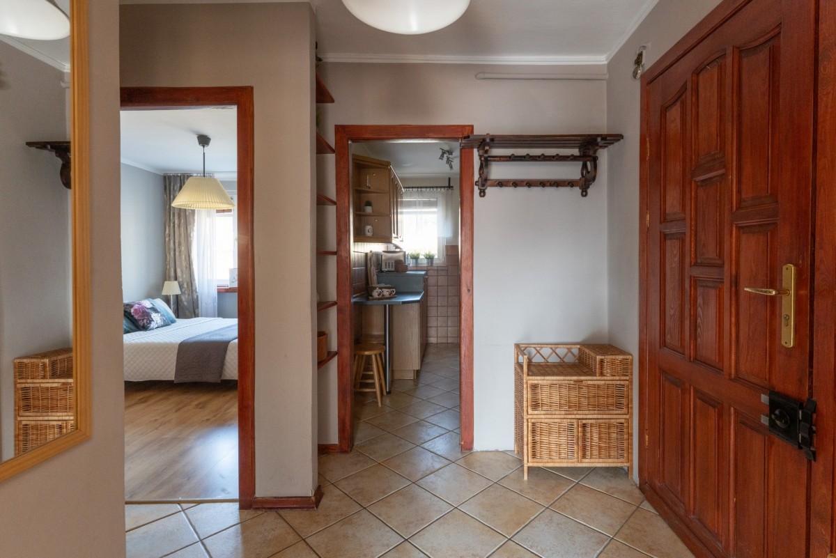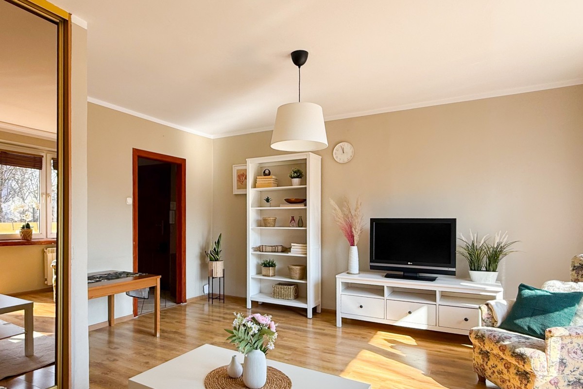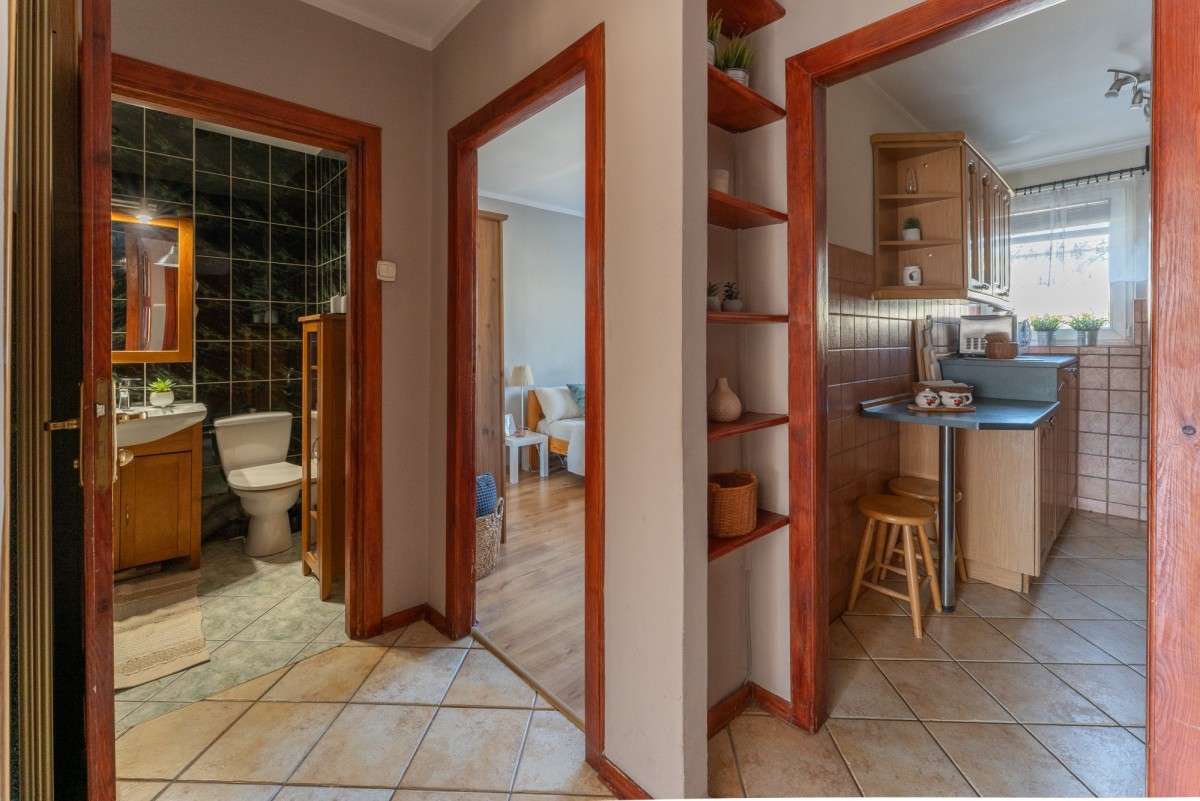 Możesz tu zamieszkać od razu - wnętrze jest zadbane, urządzone w klasycznym stylu, z przyjemną, domową atmosferą. Naturalne światło i spokojne kolory sprawiają, że przestrzeń jest ciepła i komfortowa.
