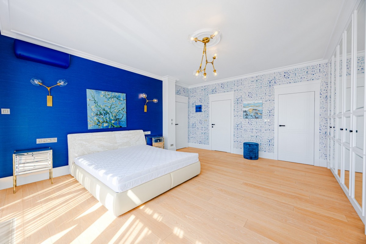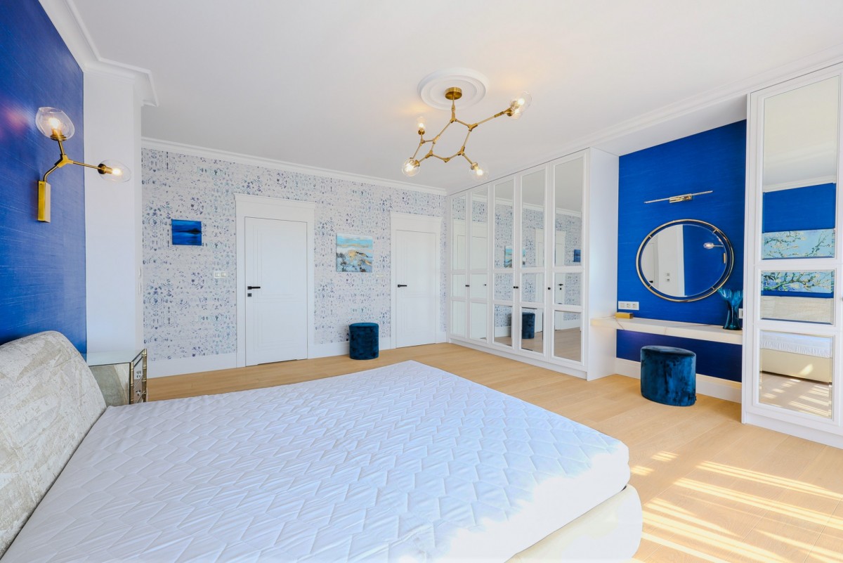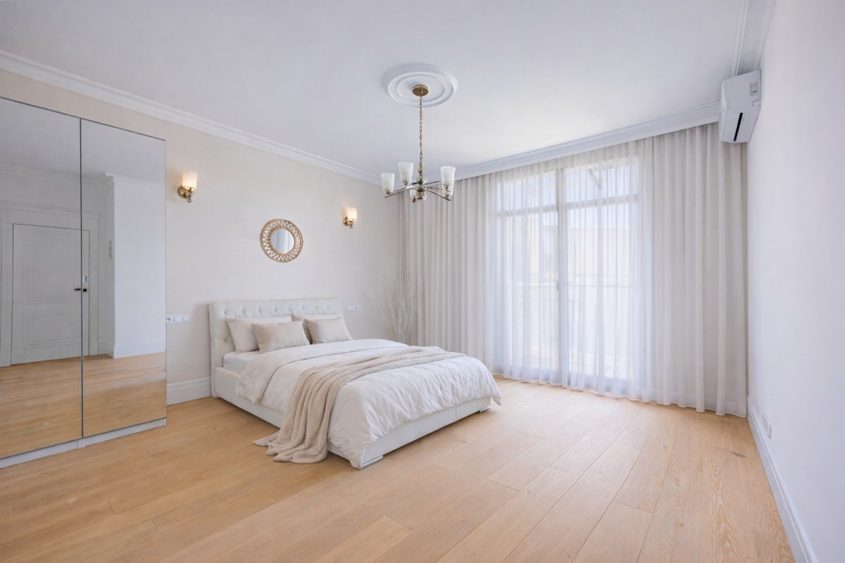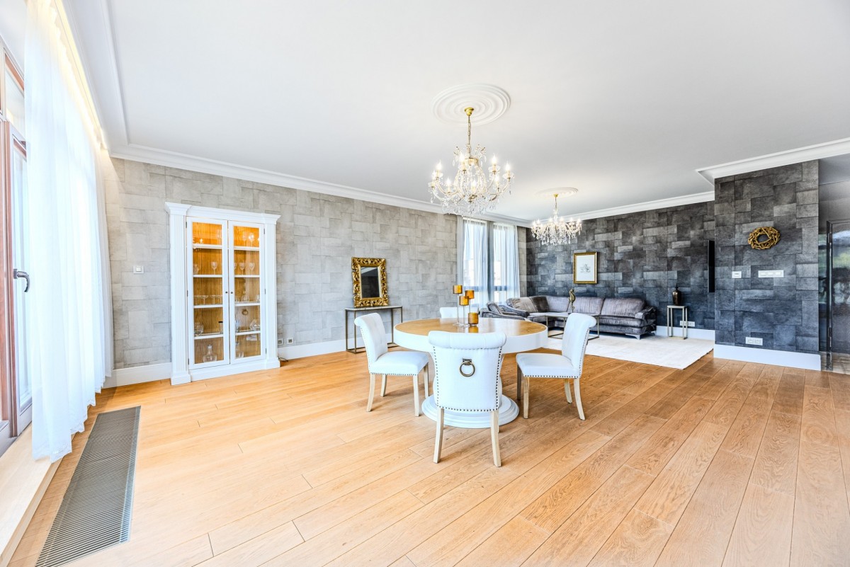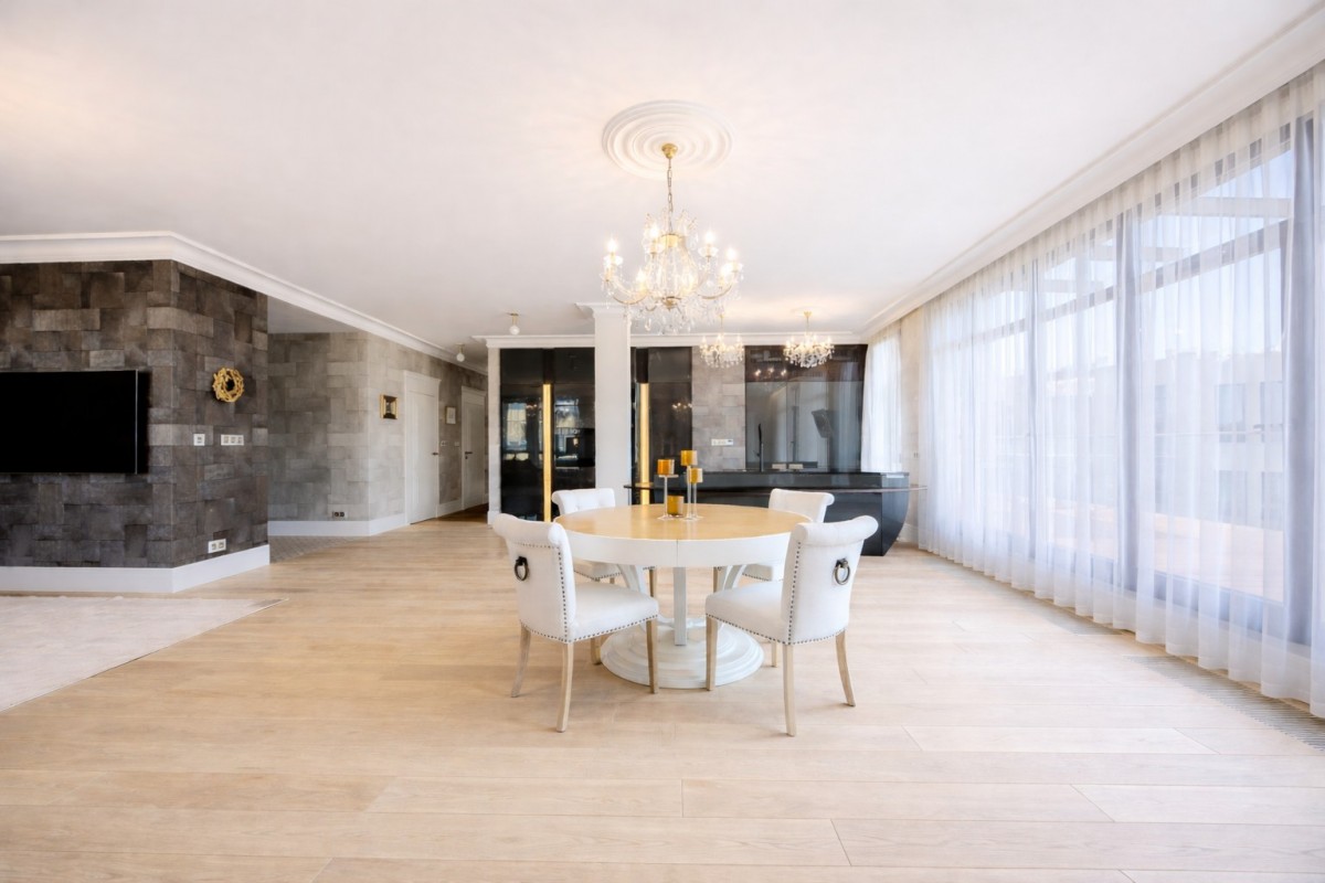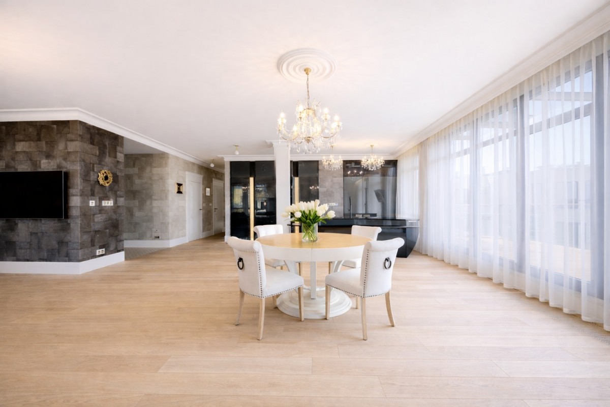 Fully furnished and equipped is included in the price (including a Kler lounge suite, marble coffee table and console table, Almi Decor oak extendable table, Eichholtz upholstered oak chairs, Almi Decor oak illuminated display cabinet, crystal chandeliers, white lacquered wooden bedroom furniture set, Kler double bed, and custom-made Eurofirany curtains).