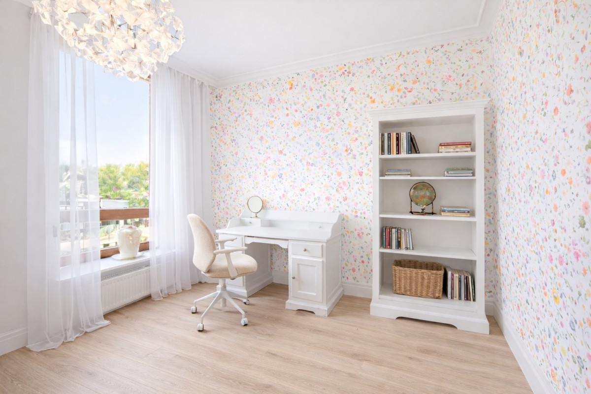 Exclusive wallpaper by the French brand Elitis covers the walls in the living room, hallways, and bedrooms. The walls and ceilings throughout the apartment are decorated with Orac stucco, and the 22 cm high Orac skirting boards (water-resistant polyurethane). All window sills are marble, and the radiators have been replaced (Zehnder), with temperature-controlled trench heaters in the living room and bedroom. The electrical fixtures have been replaced with an exclusive series featuring natural marble. Wooden doors by Moric with a raised lintel, painted white.
