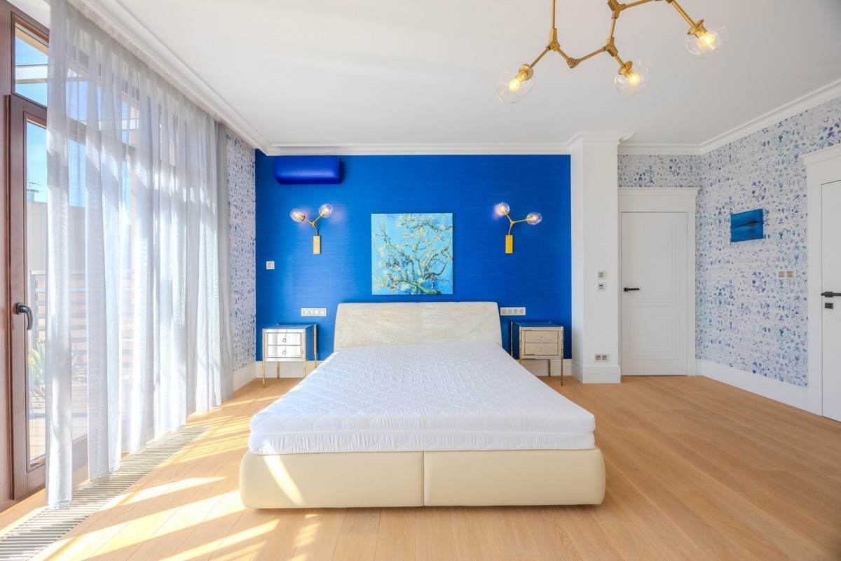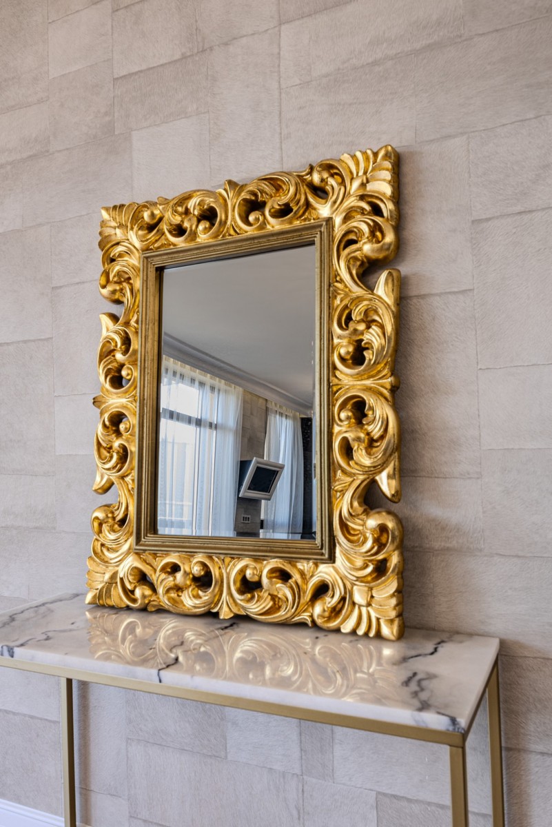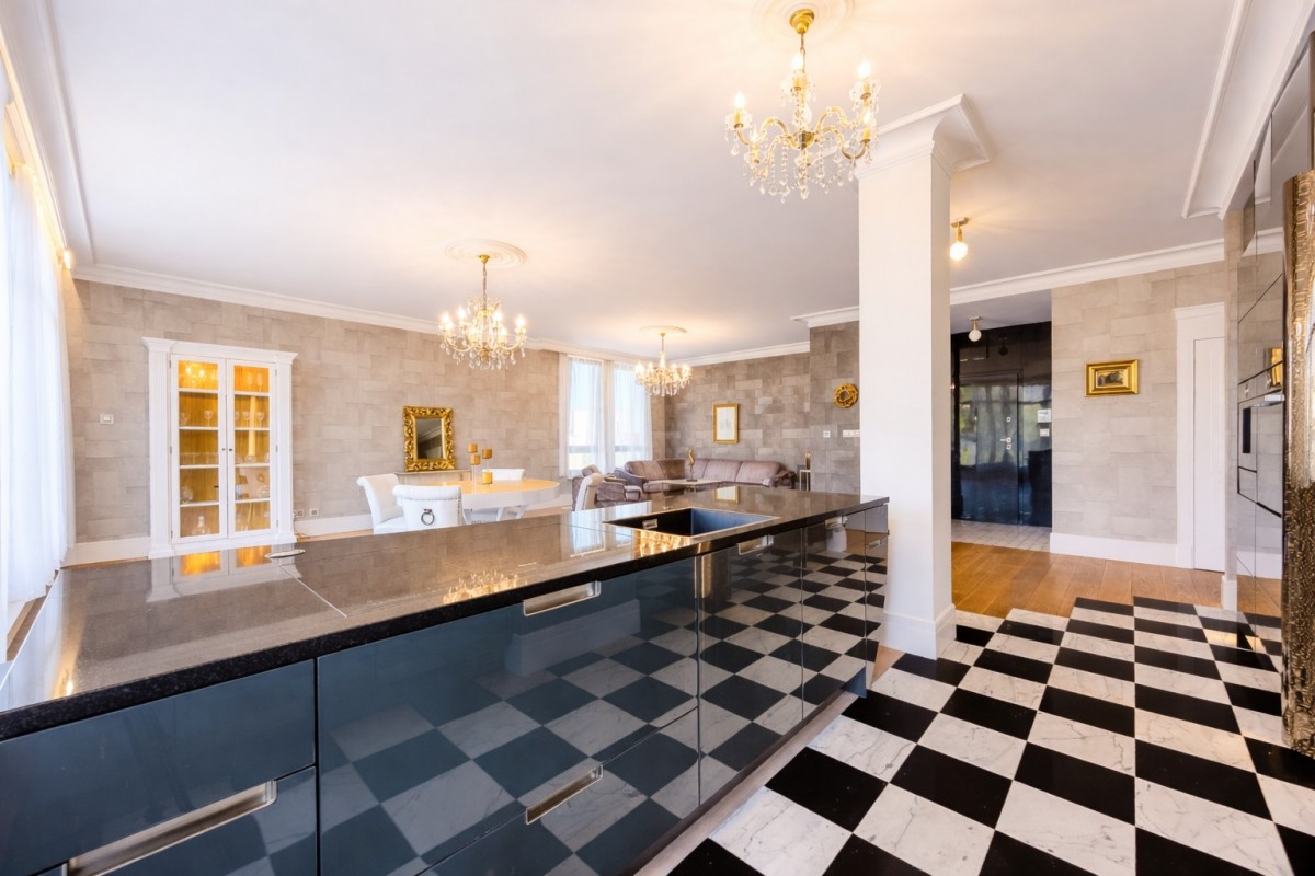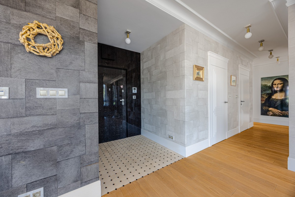 W salonie, w korytarzach oraz w sypialniach na ścianach ekskluzywne tapety francuskiej firmy Elitis. Ściany przy suficie w całym mieszkaniu ozdobione sztukaterią Orac, listwy przypodłogowy wysokości 22 cm firmy Orac (wodoodporny polidurostyren). W mieszkaniu wszystkie parapety są marmurowe, wymieniono grzejniki (Zehnder), w salonie i sypialni grzejniki kanałowe ze sterowaniem temperaturą. Wymieniono osprzęt elektryczny na ekskluzywną serię z naturalnym marmurem.