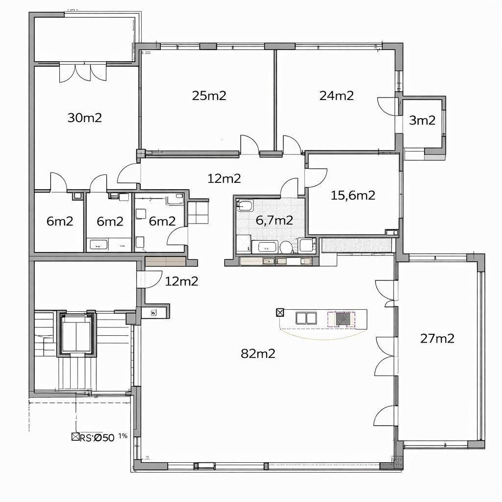 Furthermore, there is a 25 m² bedroom, a 24 m² bedroom with a 3 m² terrace, a 15.6 m² bedroom/study, a 6 m² walk-in closet, a 6 m² bathroom (with bathtub and shower), and a laundry room with space for a washing machine and dryer. The Halupczok kitchen features a black husk veneered island with a granite countertop, ample storage space, electric opening, ample storage space, drawers, and illuminated glass shelves. It features a 6-burner Miele induction cooktop, a Bosch oven, coffee maker, and warming drawer, a Siemens dishwasher, a Liebherr refrigerator, a Blanco sink with an electric stopper, and a telescopic faucet.