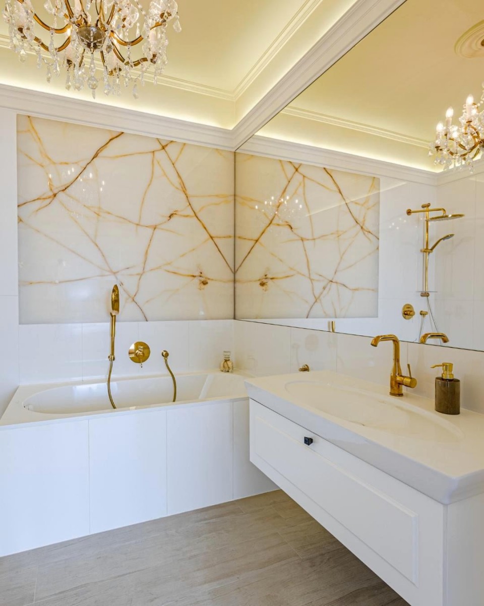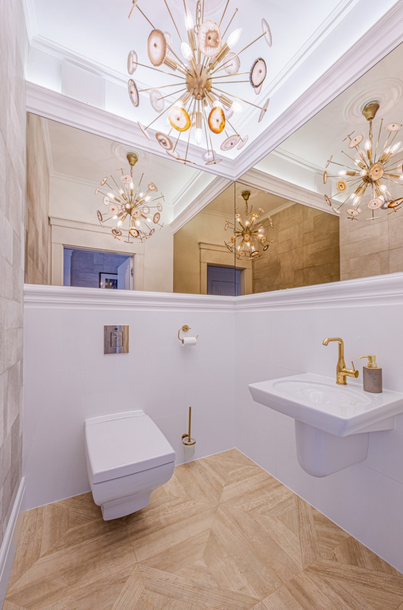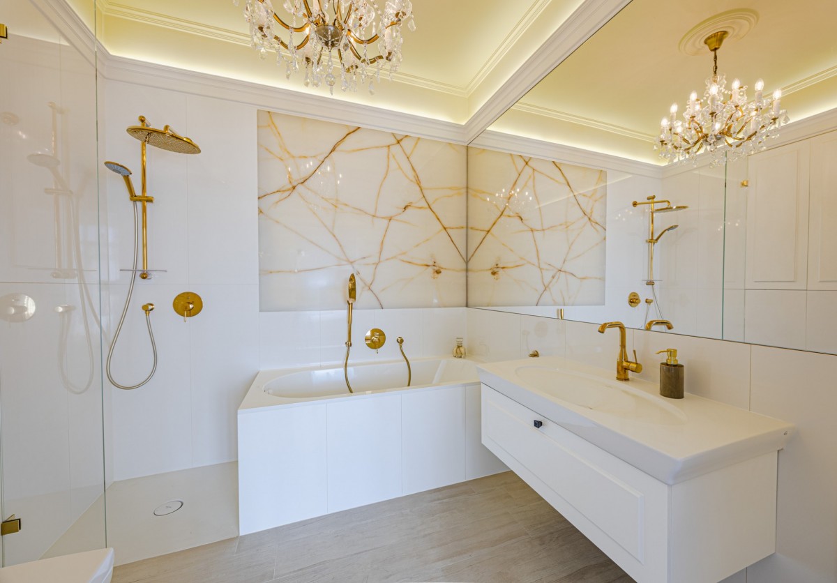 W łazienkach gres Villeroy&Boch na podłodze i na ścianach, ceramika łazienkowa Villeroy&Boch La Bella (w tym wanny z mielonego granitu) oraz armatura Grohe Essence. W obydwu łazienkach na ścianach zamontowano podświetlany naturalny onyks.