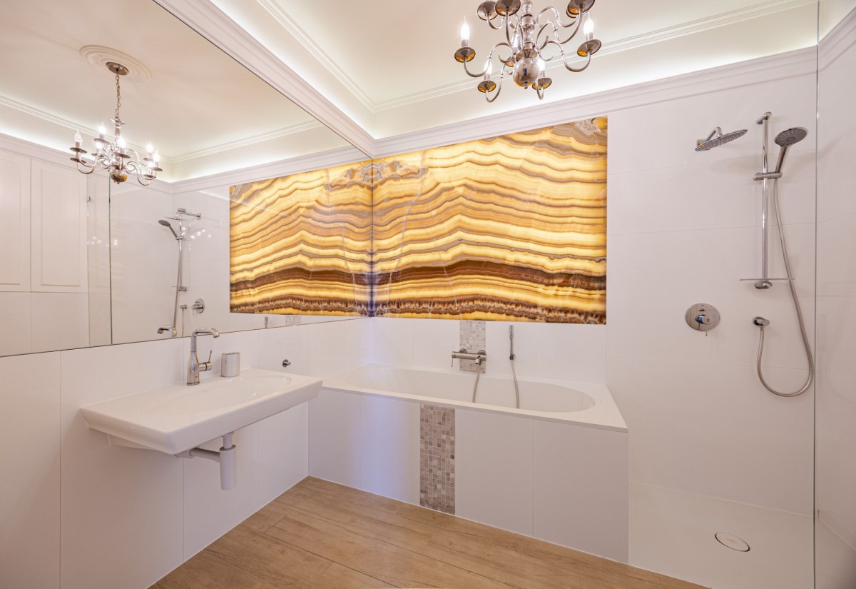 The bathrooms feature Villeroy&Boch stoneware on the floor and walls, Villeroy&Boch La Bella bathroom ceramics (including ground granite bathtubs), and Grohe Essence fixtures. Backlit natural onyx is installed on the walls in both bathrooms.