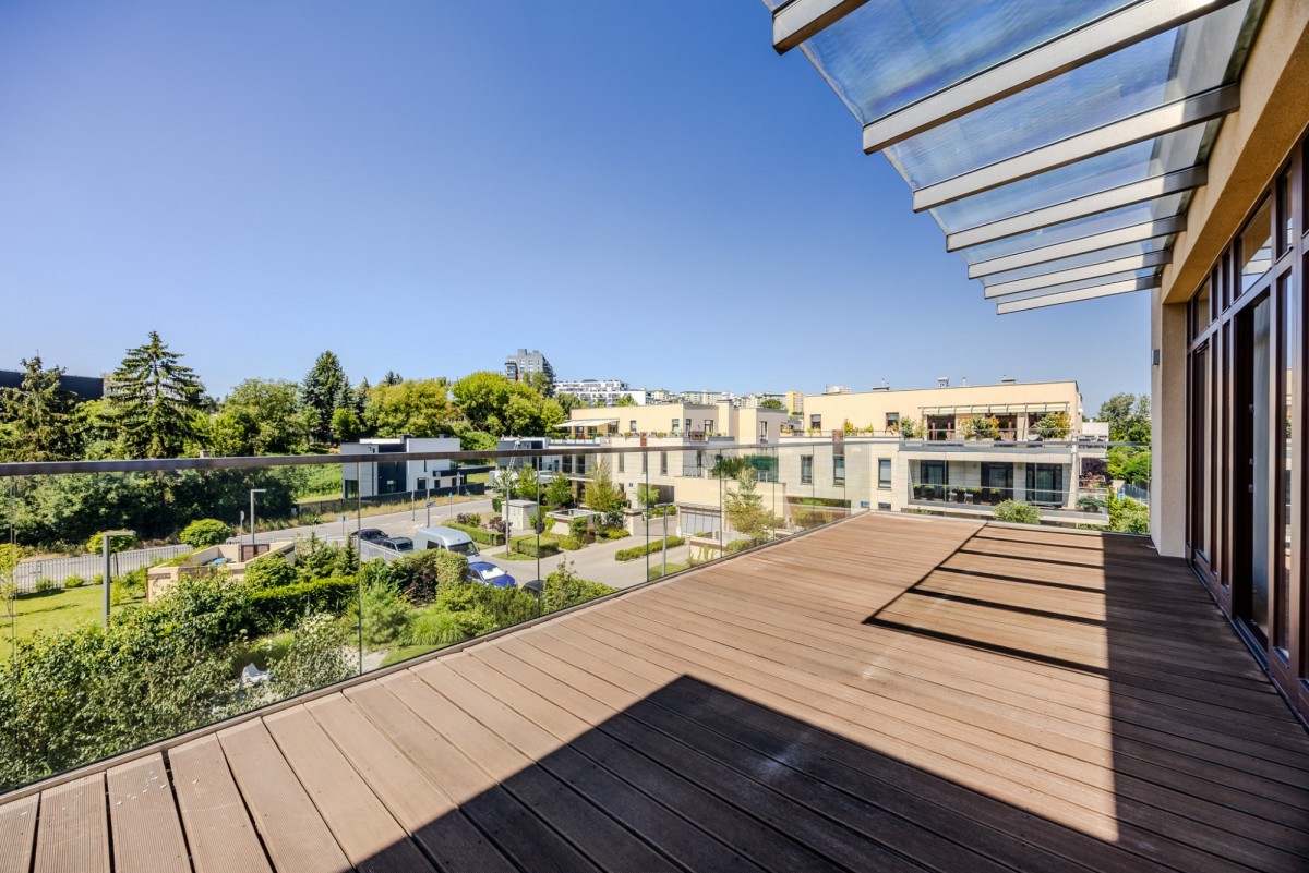 The living room is connected to the bright kitchen with a total area of 83 m² and a separate dining area open to the hallway. The living room's south wall has 8-meter-long glass, which opens onto a 30 m² terrace finished in exotic wood.